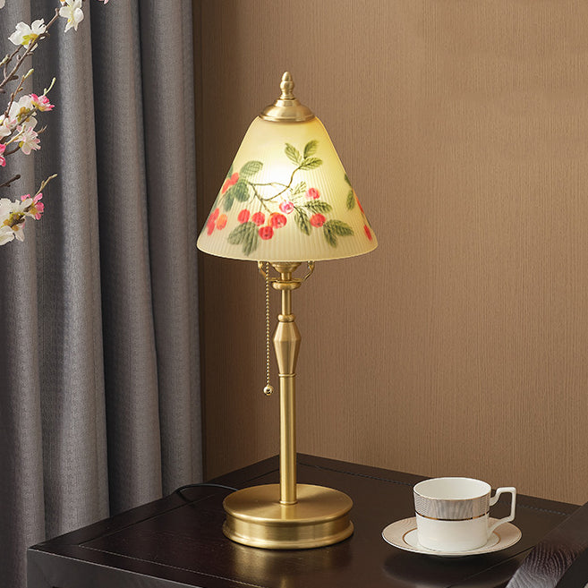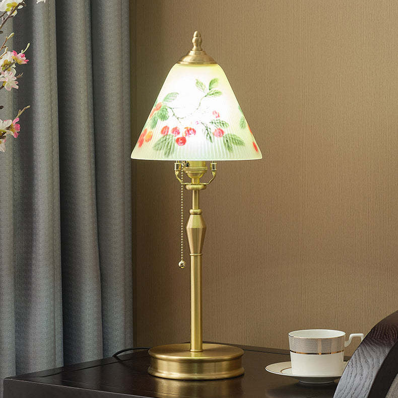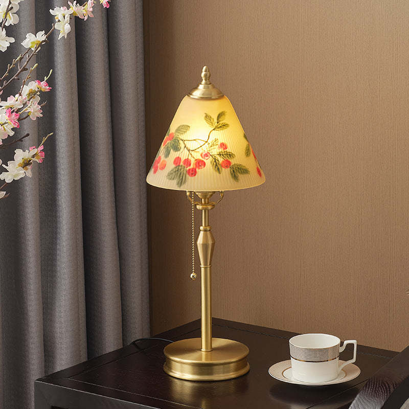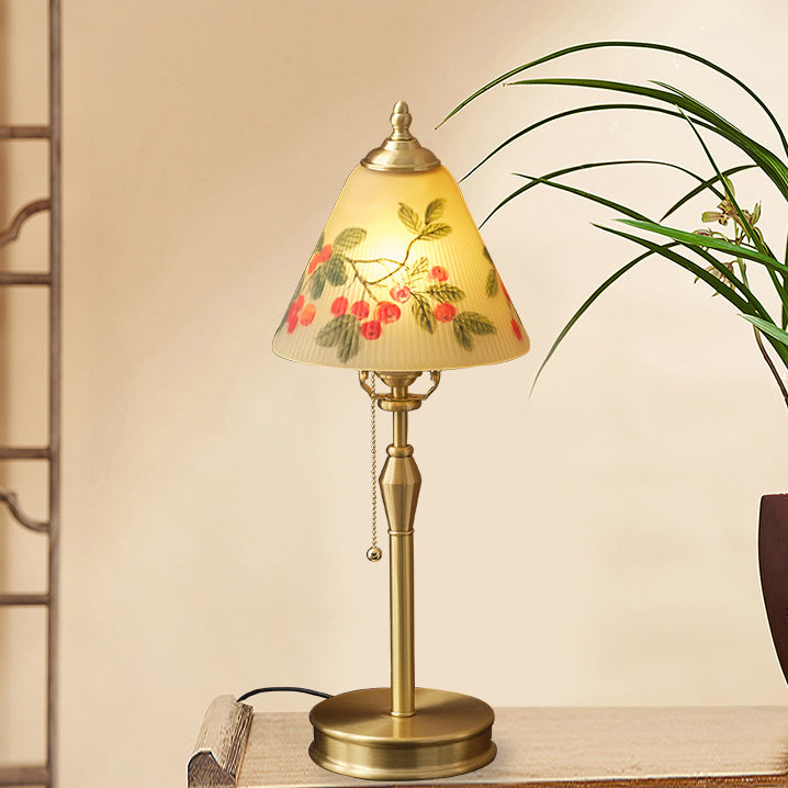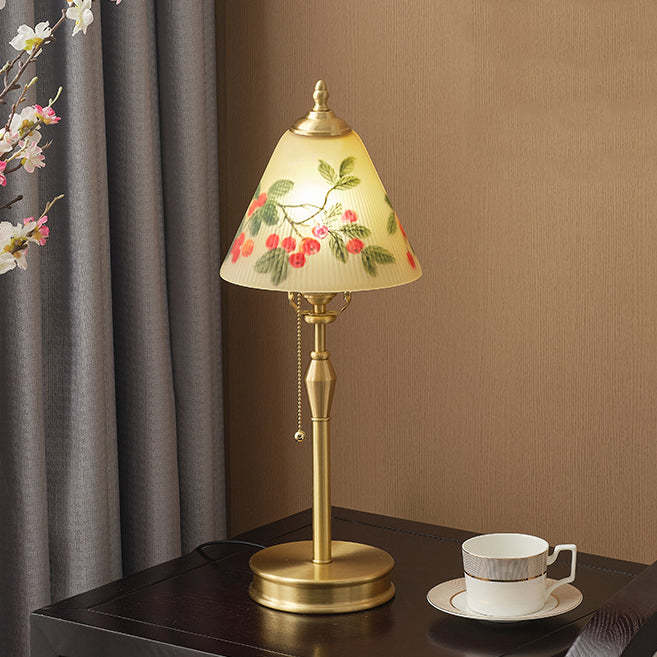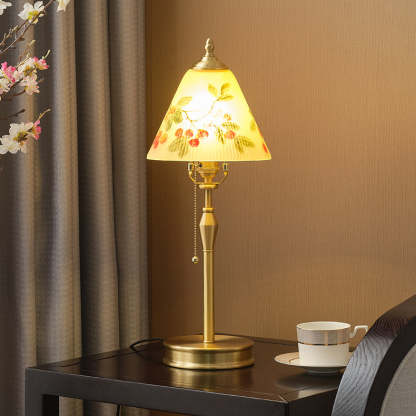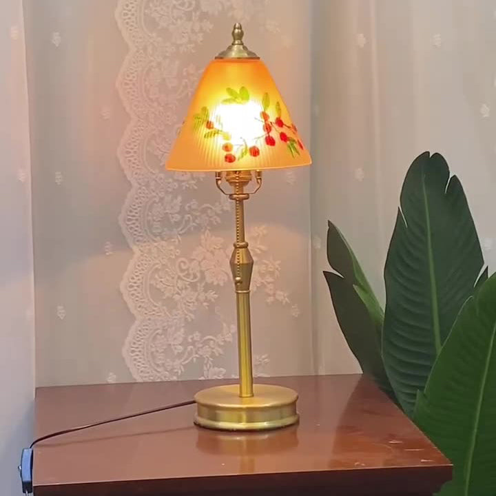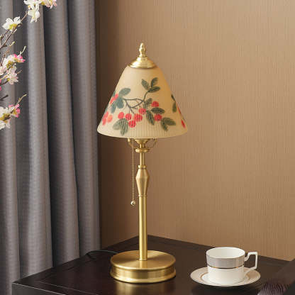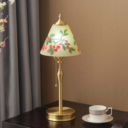 Traditional Chinese Brass & Glass Painted Cherry Cone 1-Light Table Lamp For Bedroom