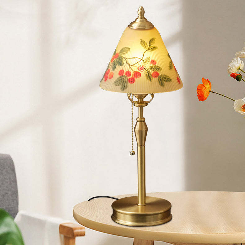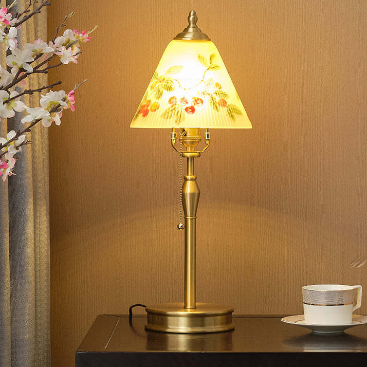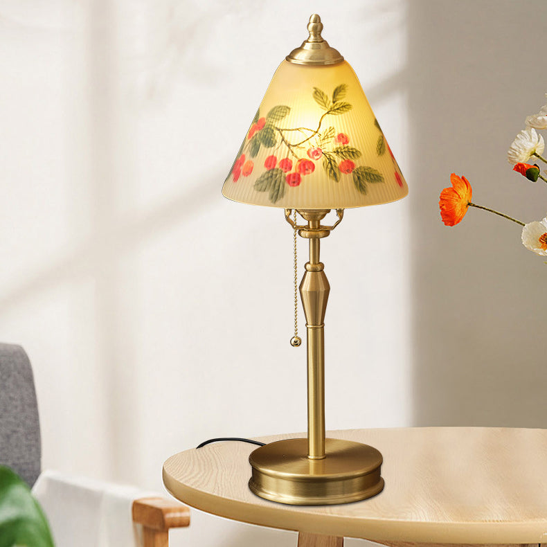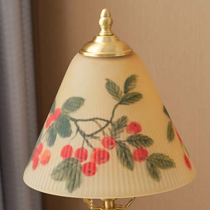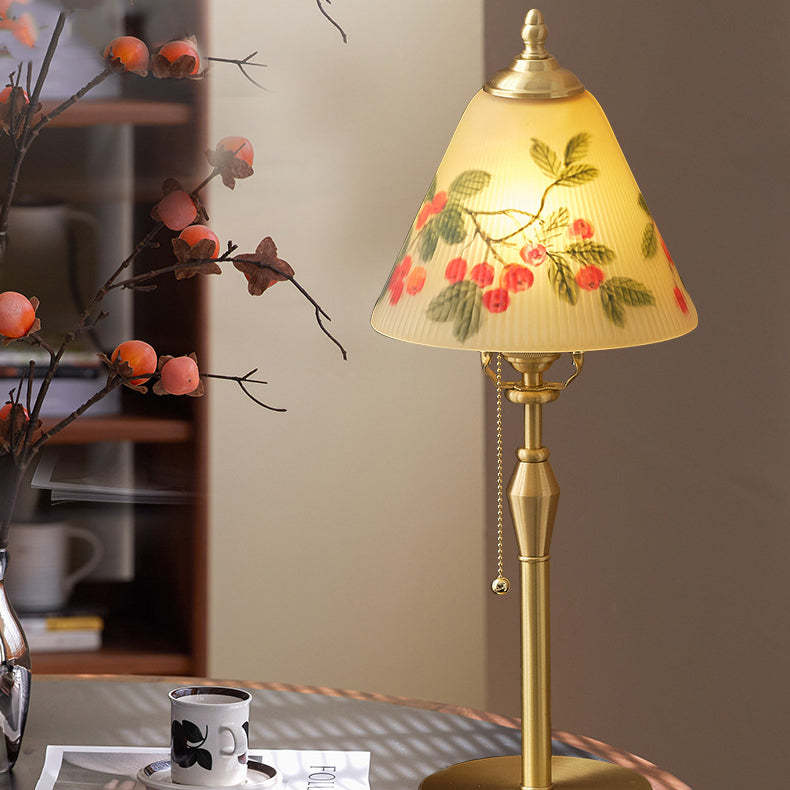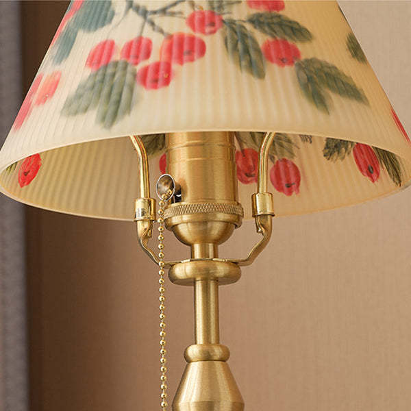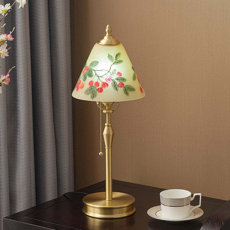 Traditional Chinese Brass & Glass Painted Cherry Cone 1-Light Table Lamp For Bedroom