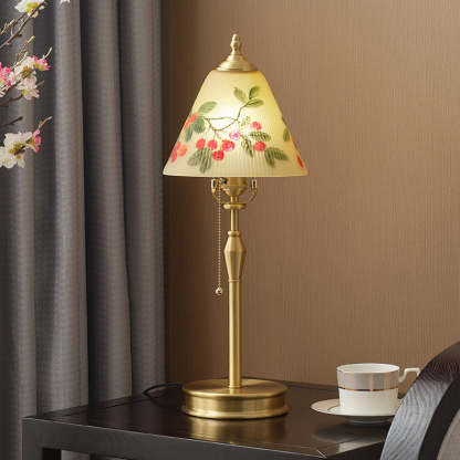 This traditional Chinese-style table lamp features a hand-painted glass cone-shaped shade with cherry motifs and a sturdy round brass base in natural copper with red and green accents. Equipped with a convenient pull-chain switch. it brings artistic charm and soft ambient lighting to any bedroom d��cor.