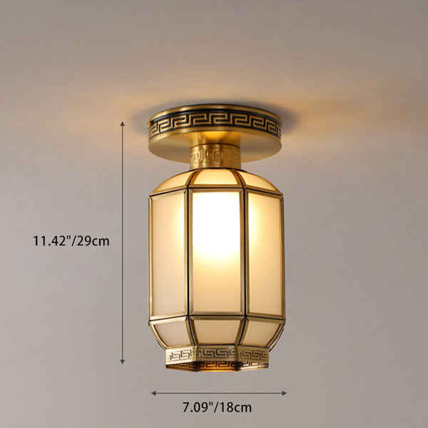 Traditional Chinese Cylinder Round Glass Copper 1-Light Semi-Flush Mount Ceiling Light For Living Room