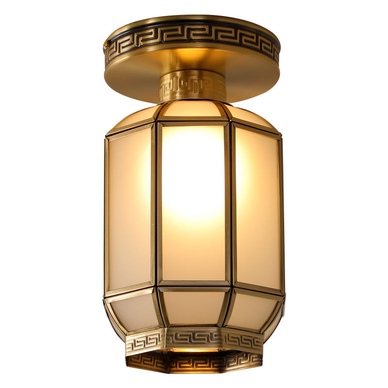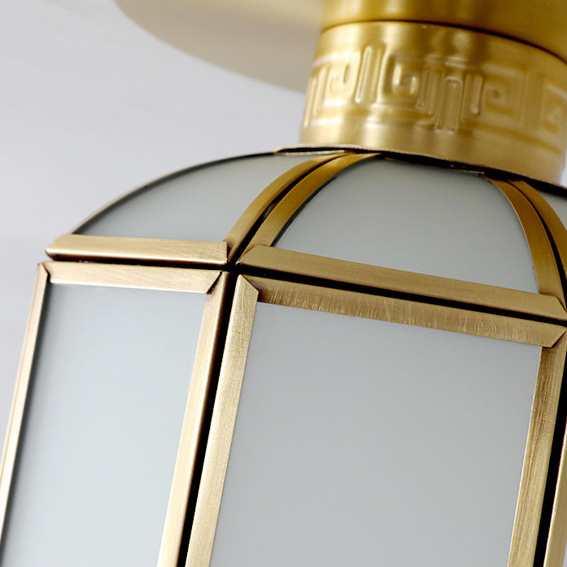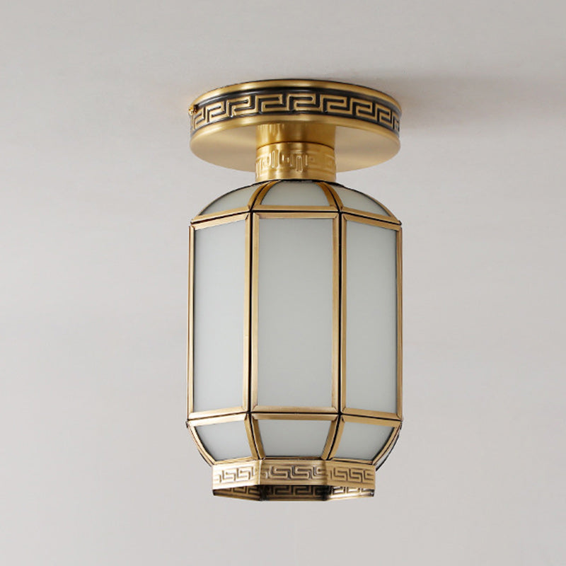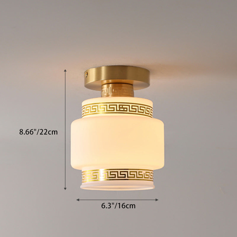 Traditional Chinese Cylinder Round Glass Copper 1-Light Semi-Flush Mount Ceiling Light For Living Room
