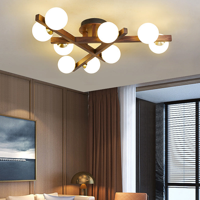 Traditional Chinese Long Round Ball Wooden Copper Frame Glass Shade 3/6/9 Light Semi-Flush Mount Ceiling Light For Living Room