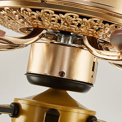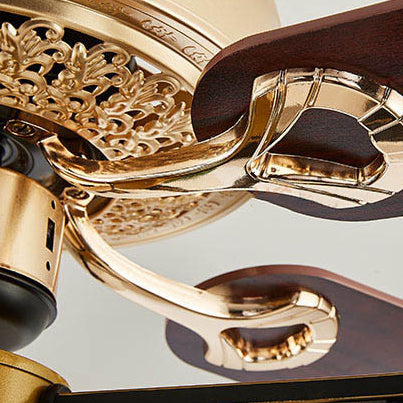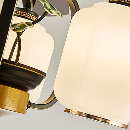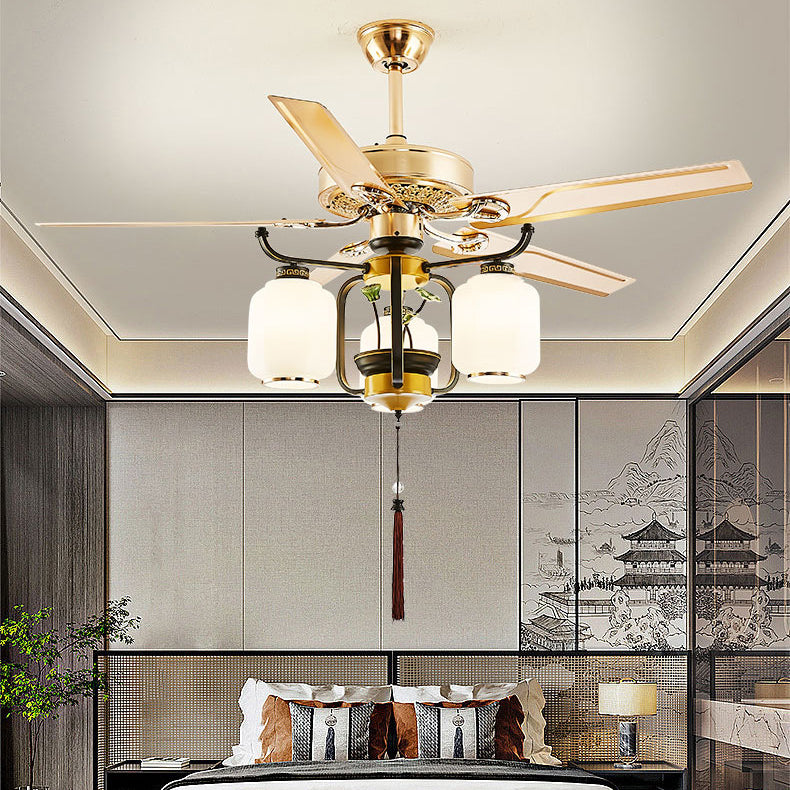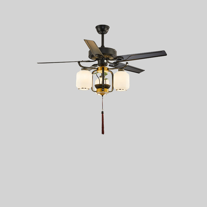 Traditional Chinese Round Lantern Iron Wood Fan Leaf Glass Shade 3/6 Light Downrod Ceiling Fan Light For Living Room