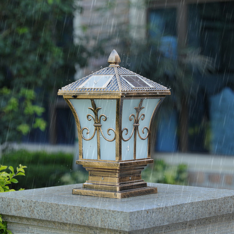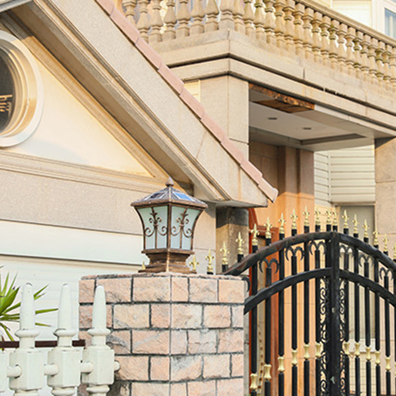 Traditional Chinese Solar Waterproof Quadrangle Carved Aluminum Glass LED Post Head Light Outdoor Light For Garden