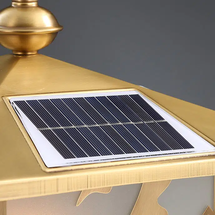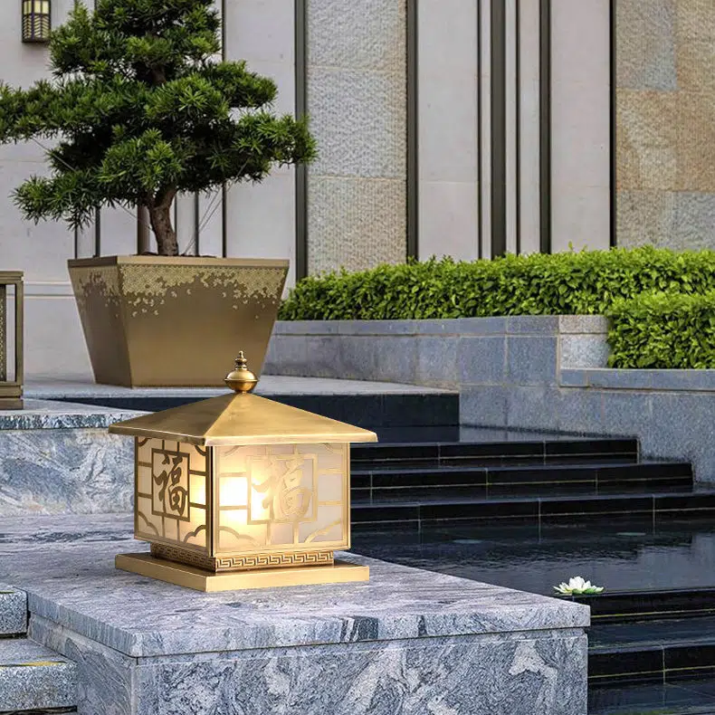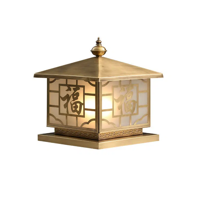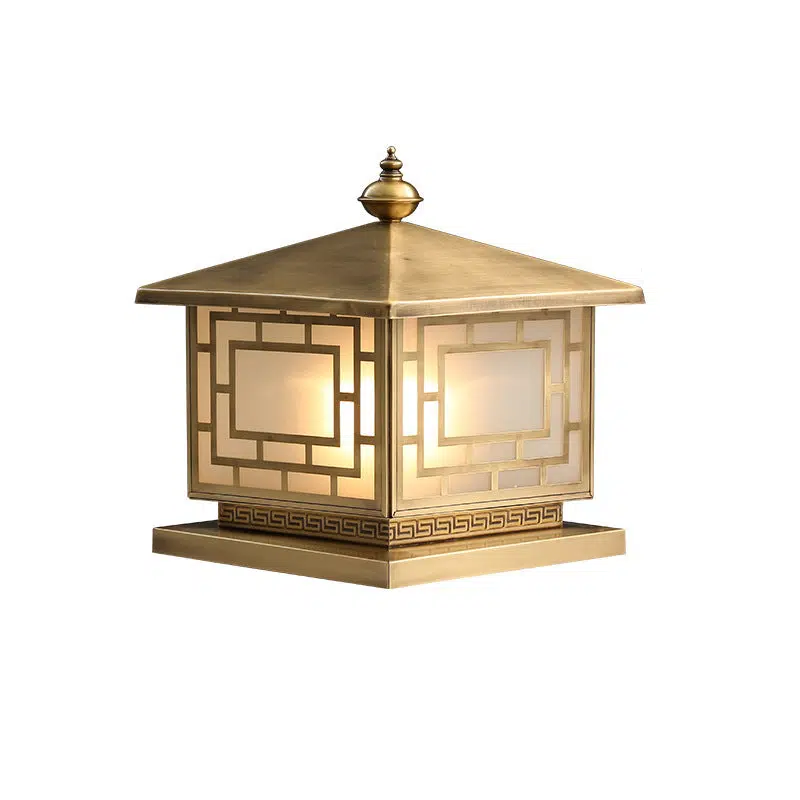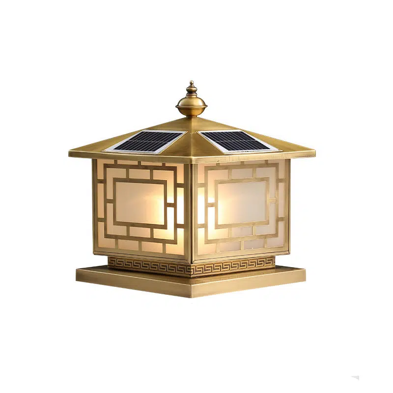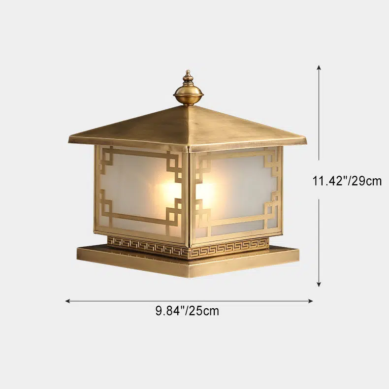 Traditional Chinese Square Full Copper Glass 1-Light Solar Outdoor Post Head Light For Garden