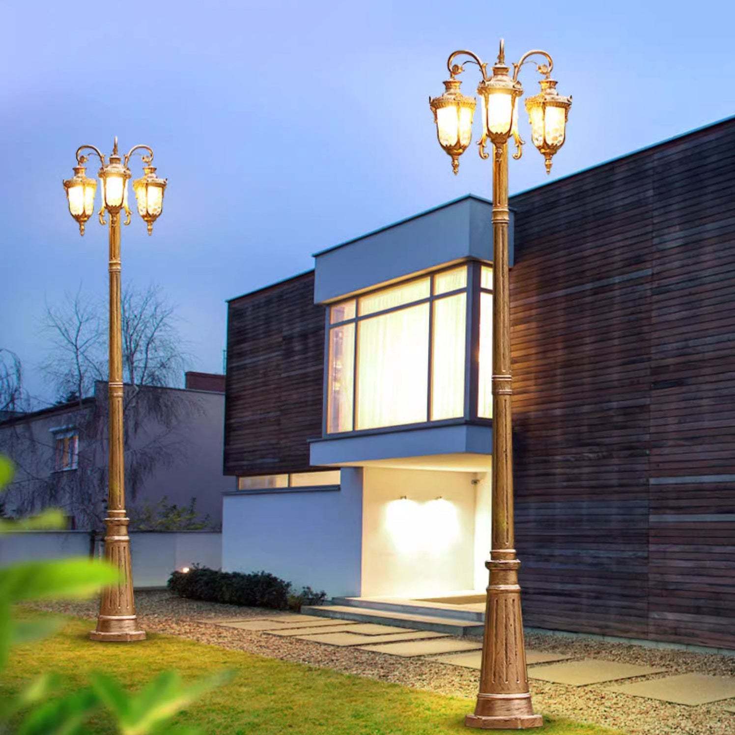 Enhance your garden or villa with this traditional European-style outdoor light. featuring a sturdy die-cast aluminum frame. elegant water-patterned glass. and a classic cylindrical post. Available in antique bronze and black. this 3-light fixture is IP65 waterproof. rust-resistant. and designed for lasting beauty and performance.