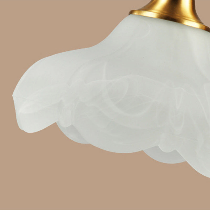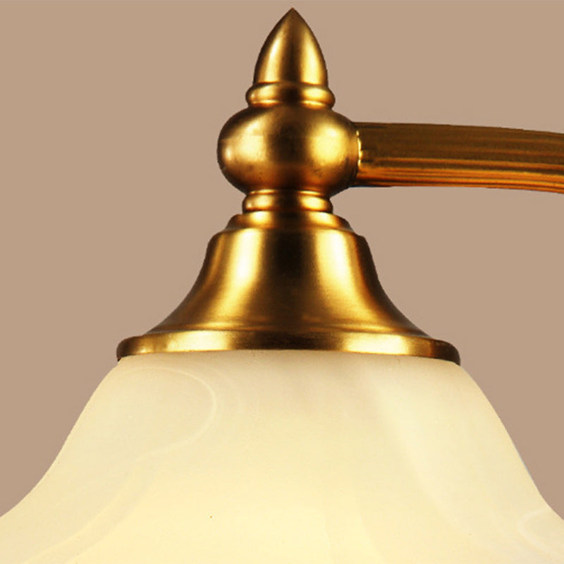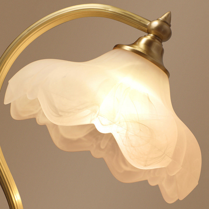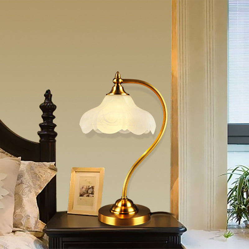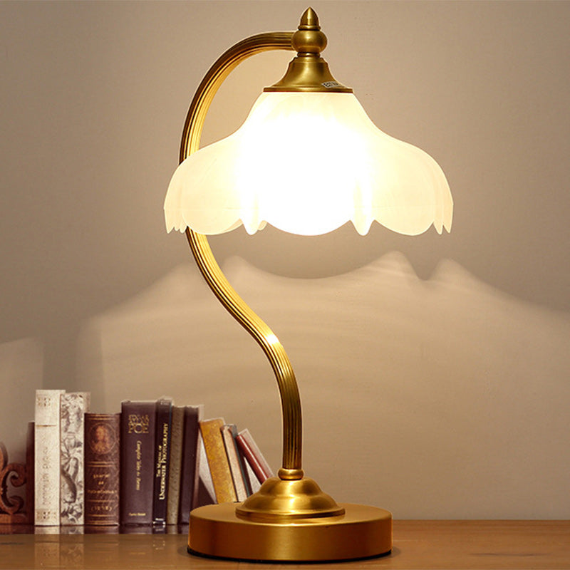 Elegant and timeless. this gold-toned table lamp features a round brass base and delicate flower-shaped glass shade. perfect as a bedside accent. Designed in classic European style. it adds warm ambient lighting and refined charm to any bedroom.
