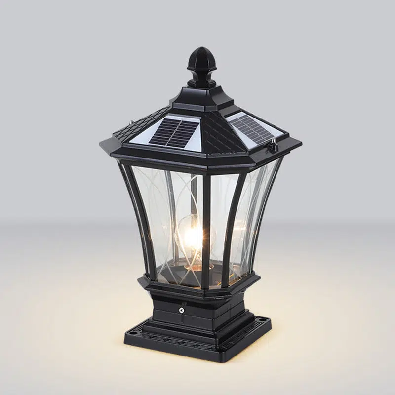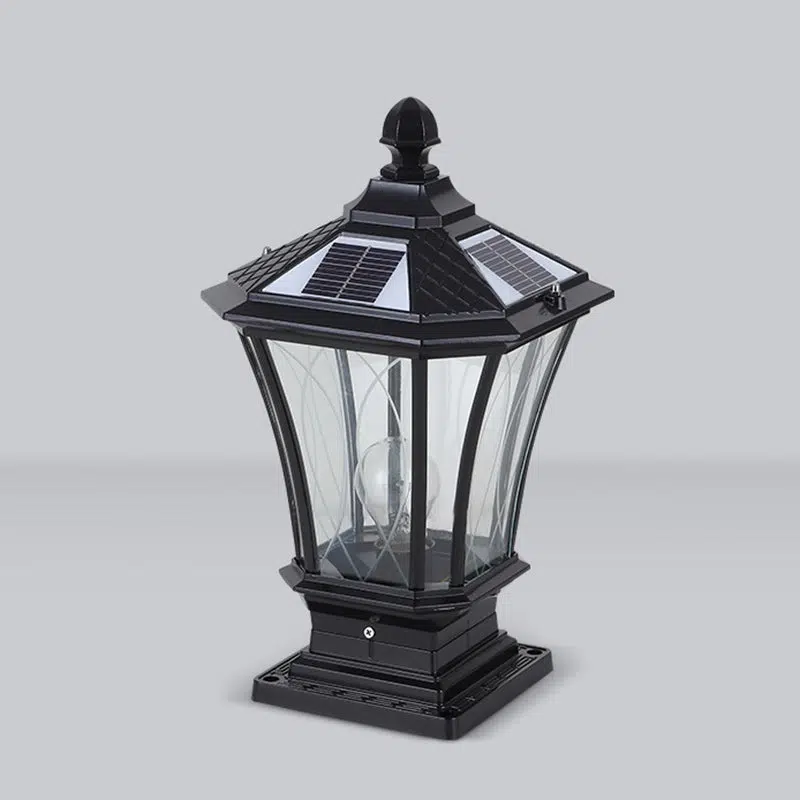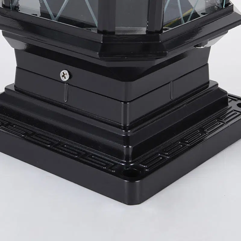 This solar-powered outdoor post head light features a carved octagonal glass design in black or antique bronze. combining waterproof and dustproof durability with classic European style. Ideal for garden pillars. gates. and villa entrances. it provides energy-efficient LED lighting day and night.
