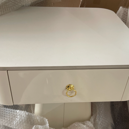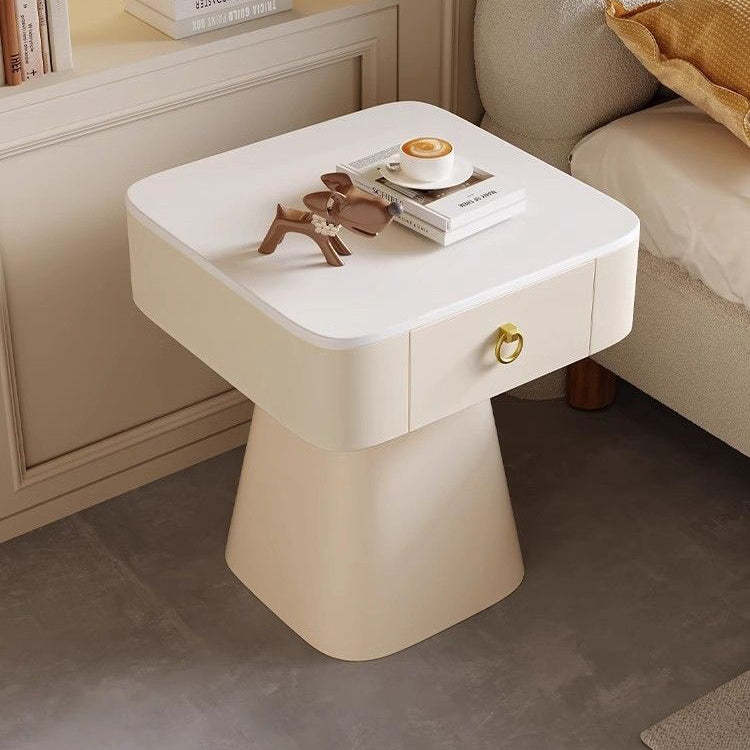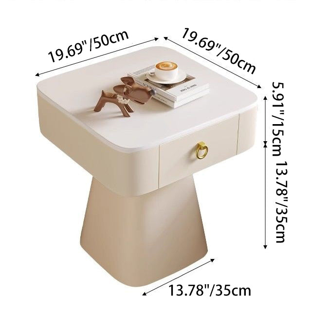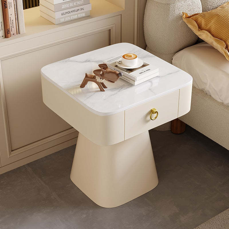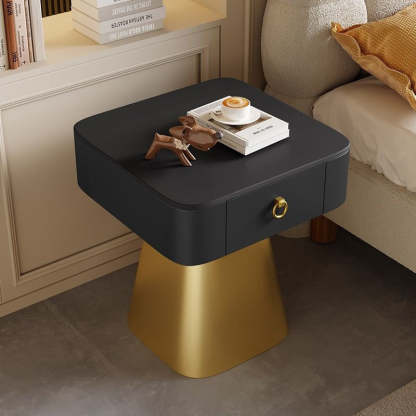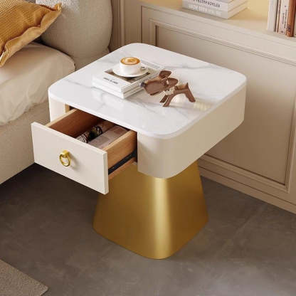 Elevate your bedroom or living room with this traditional French nightstand. featuring a carbon steel frame. a durable rock slab top. a square tabletop. and a unique pyramid-shaped base. Available in elegant beige. gold. and black finishes. with one drawer for practical storage.