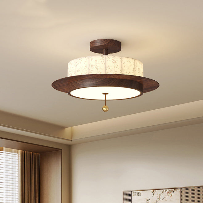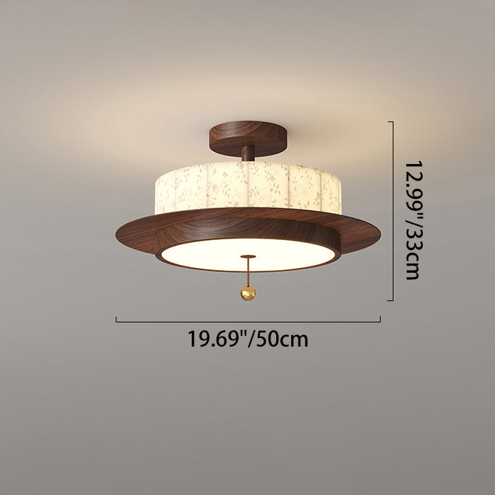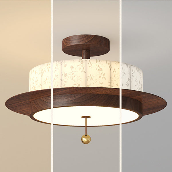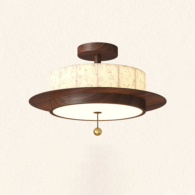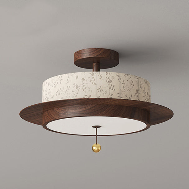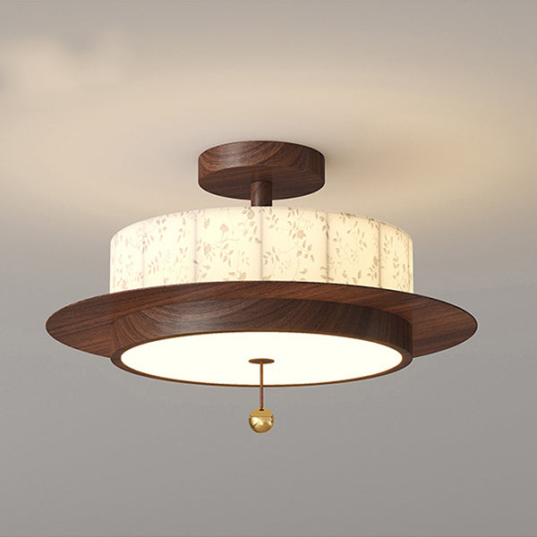 Traditional French Round Cylinder Flower Print Iron Fabric Wood LED Semi-Flush Mount Ceiling Light For Bedroom