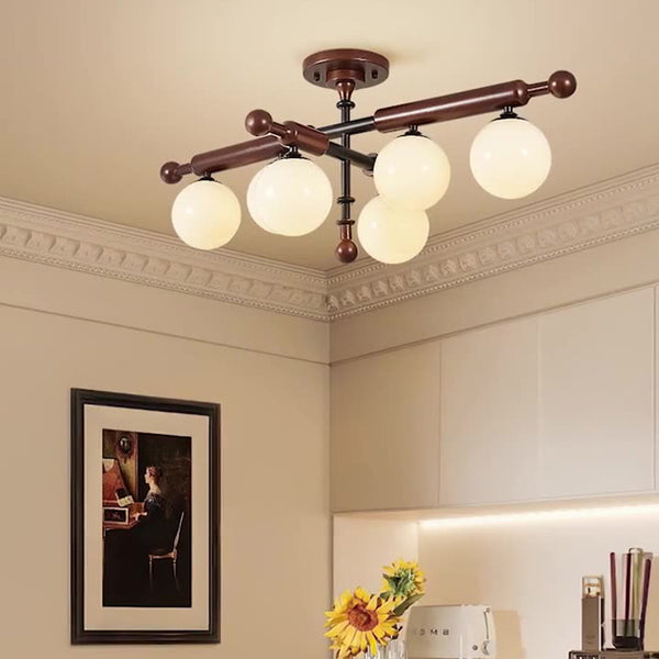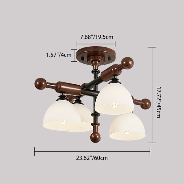 Traditional French Solid Wood Frame Glass Round Shade 4/6-Light Semi-Flush Mount Ceiling Light For Living Room