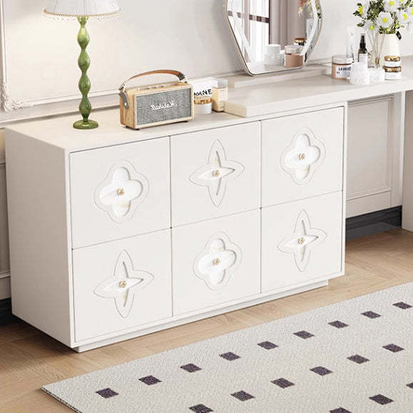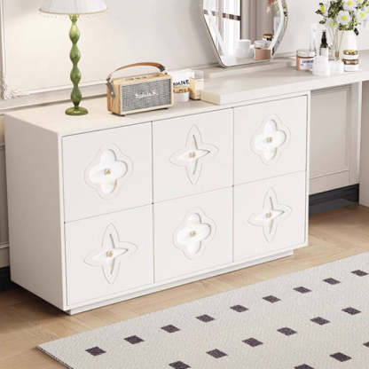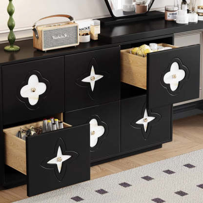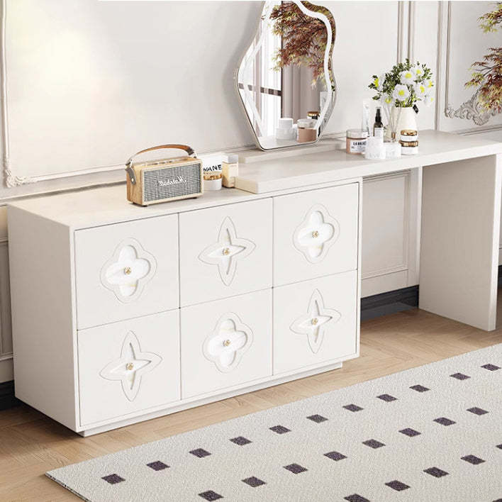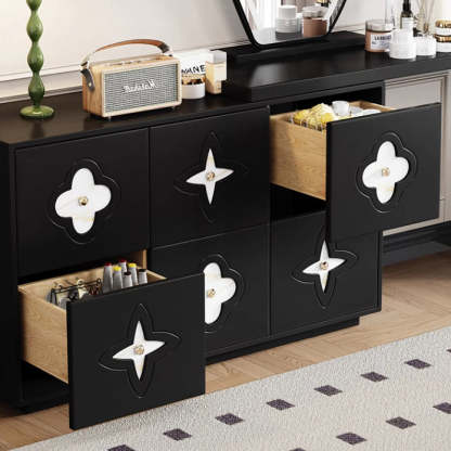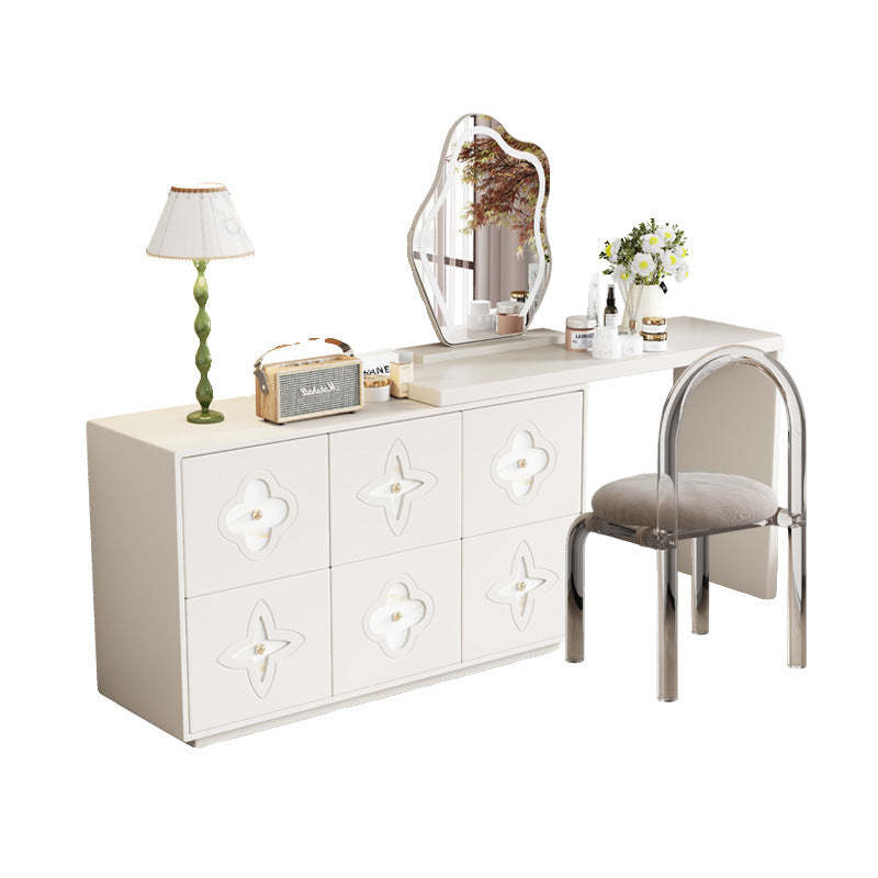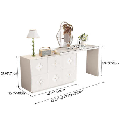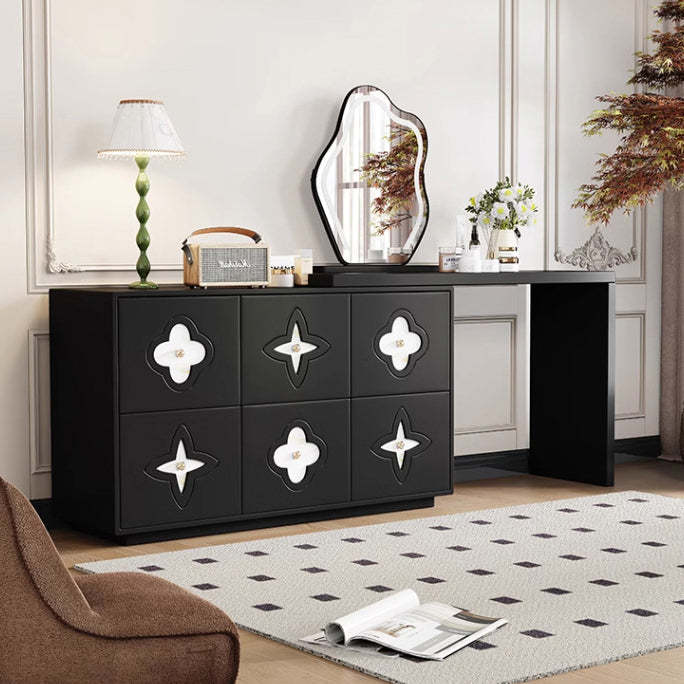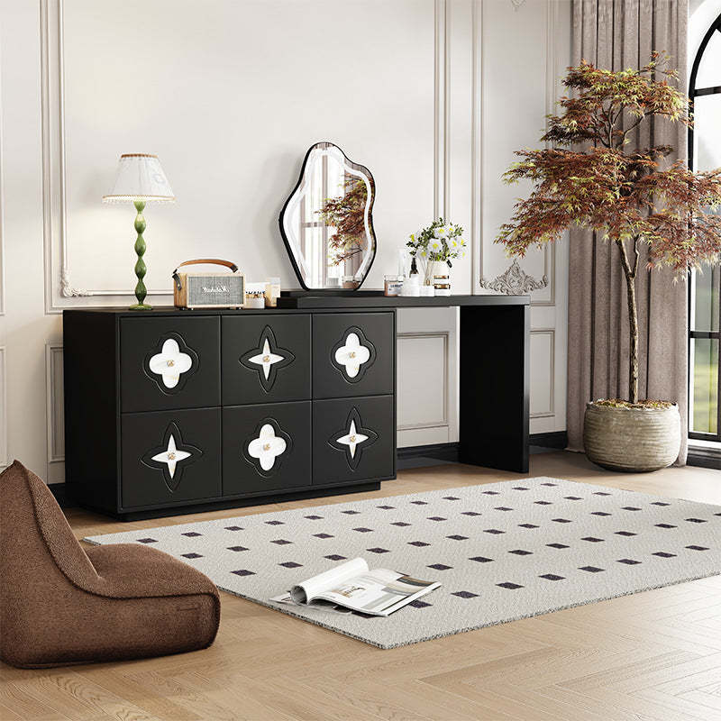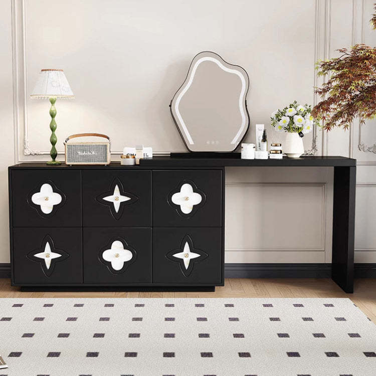 This traditional French-style vanity table features a sleek rectangular design with a charming clover pattern. crafted from solid wood in black and white options. With six spacious drawers. a built-in mirror. and a space-saving extendable design. it brings both elegance and functionality to your bedroom.