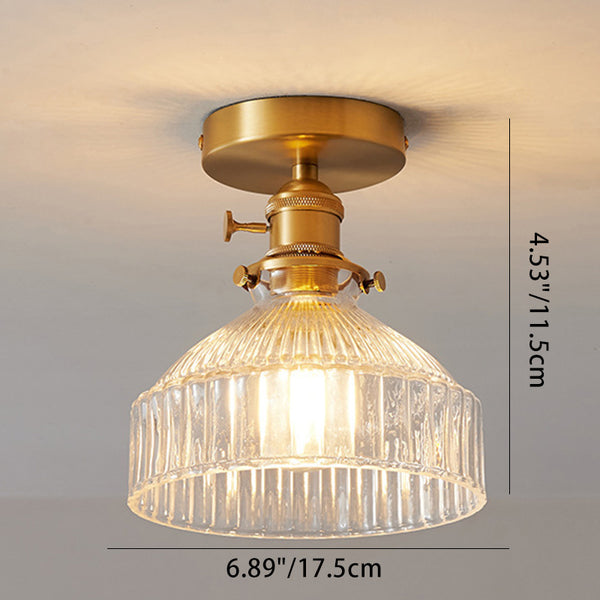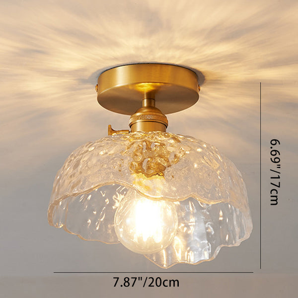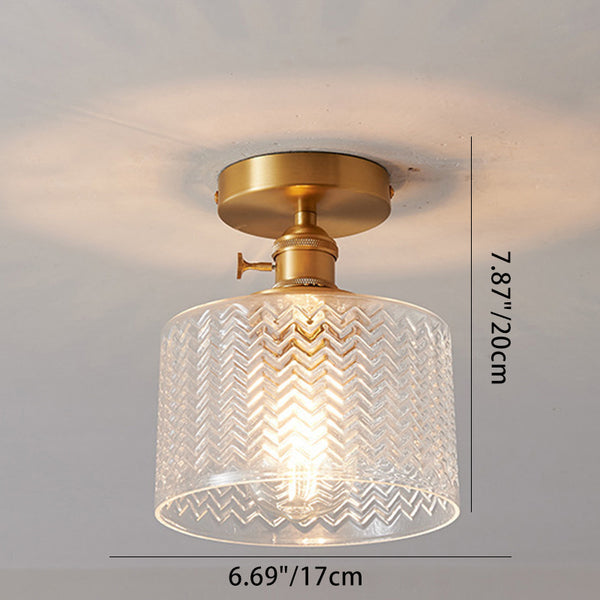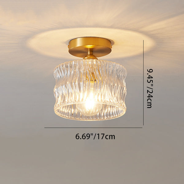 Traditional Japanese Brass Glass Bowl Cylinder Ripple 1-Light Semi-Flush Mount Ceiling Light For Hallway