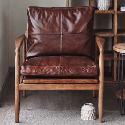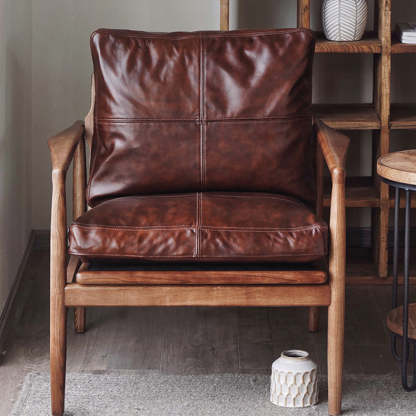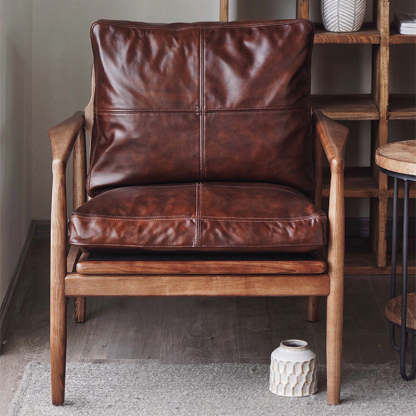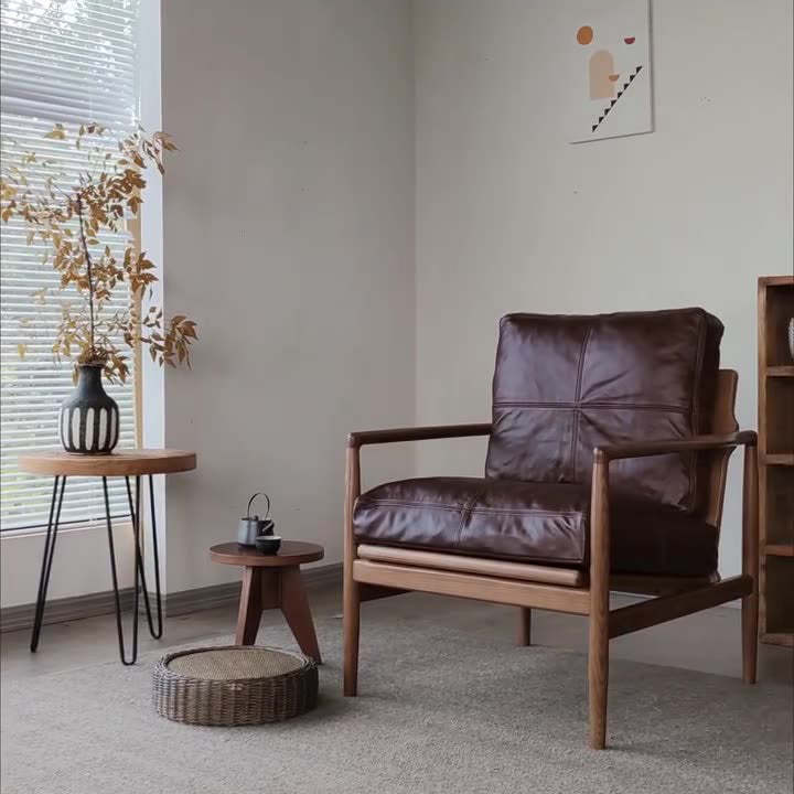 This brown leather and wood sofa chair features a square. straight-edge design inspired by traditional Japanese aesthetics. With a comfortable backrest. armrests. and thick padding. it offers durable. cozy seating perfect for bedrooms. living rooms. hotels. or small spaces.