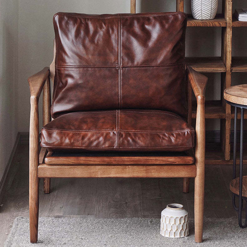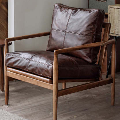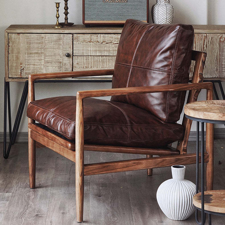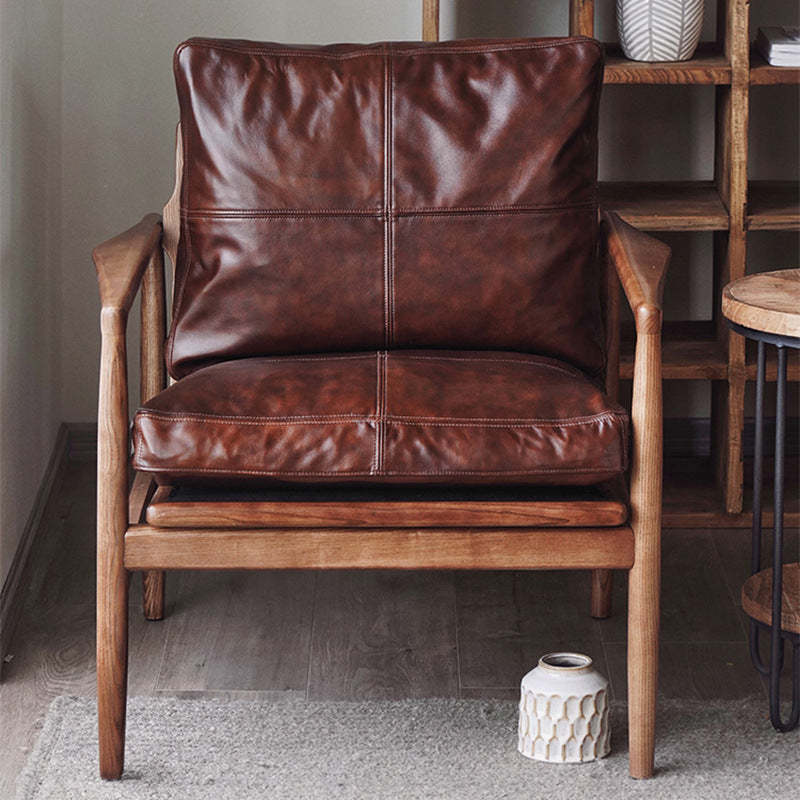 Traditional Japanese Leather Wood Square Straight-Edge Accent Chair With Backrest Armrests For Bedroom & Living Room