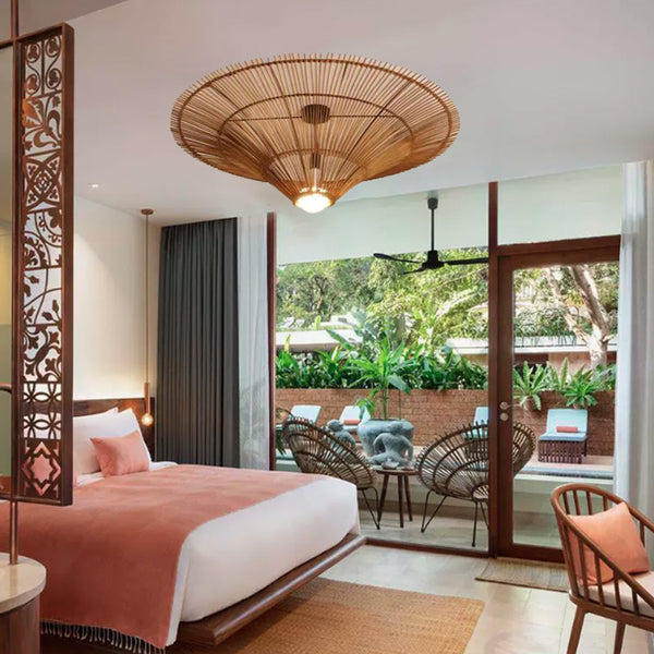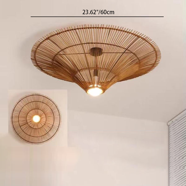 Traditional Japanese Rattan Weaving Hat 1-Light Semi-Flush Mount Ceiling Light For Living Room