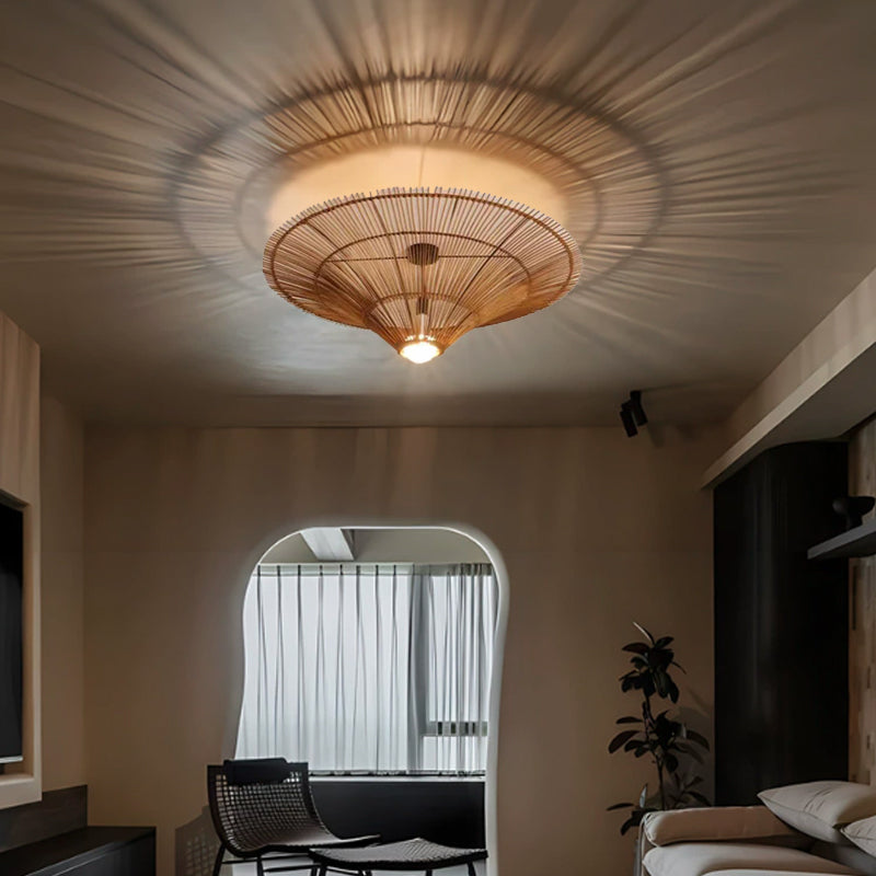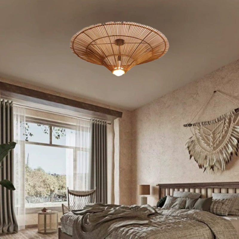 Traditional Japanese Rattan Weaving Hat 1-Light Semi-Flush Mount Ceiling Light For Living Room