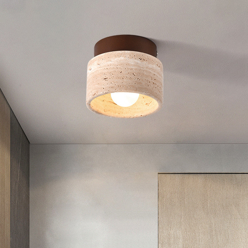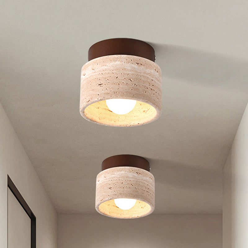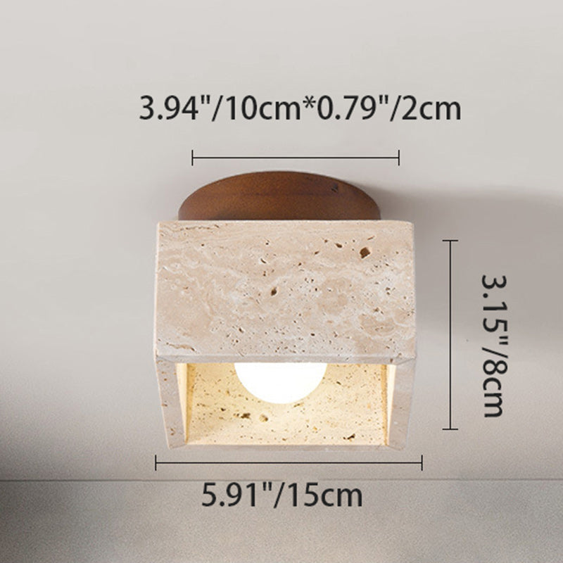 Traditional Japanese Round Square Stone Wood 1-Light Semi-Flush Mount Ceiling Light For Living Room
