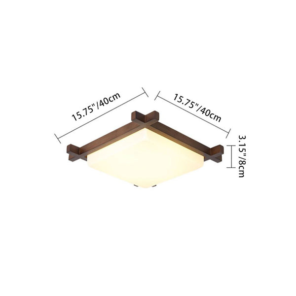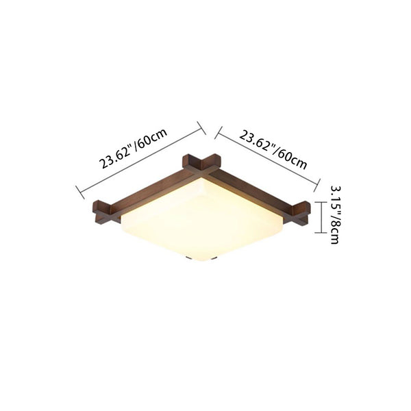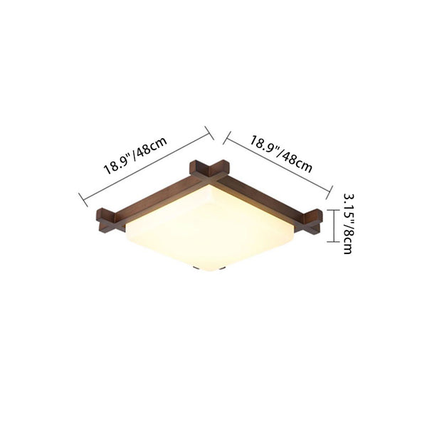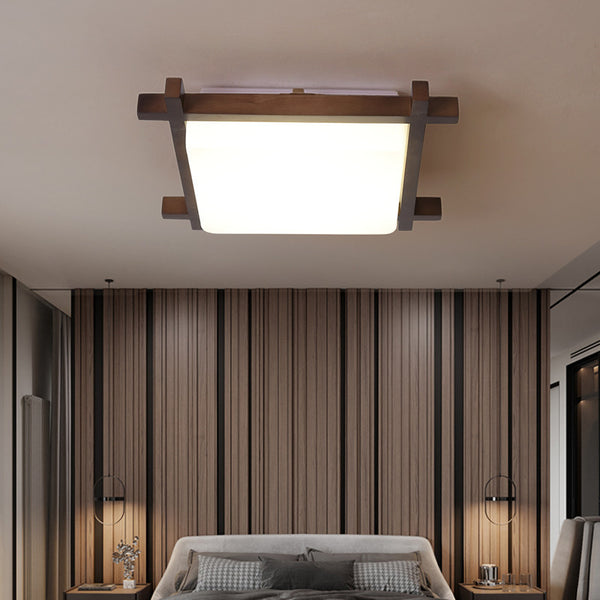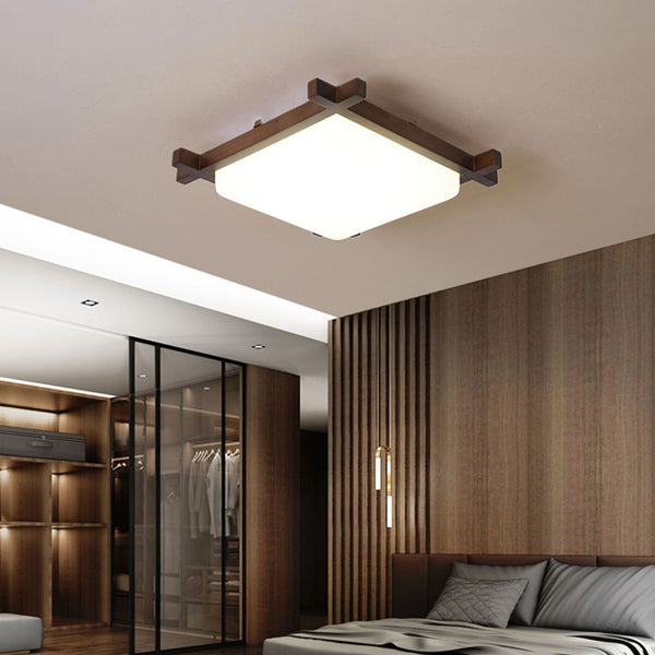 Traditional Japanese Square Rubber Wood Acrylic LED Flush Mount Ceiling Light For Bedroom