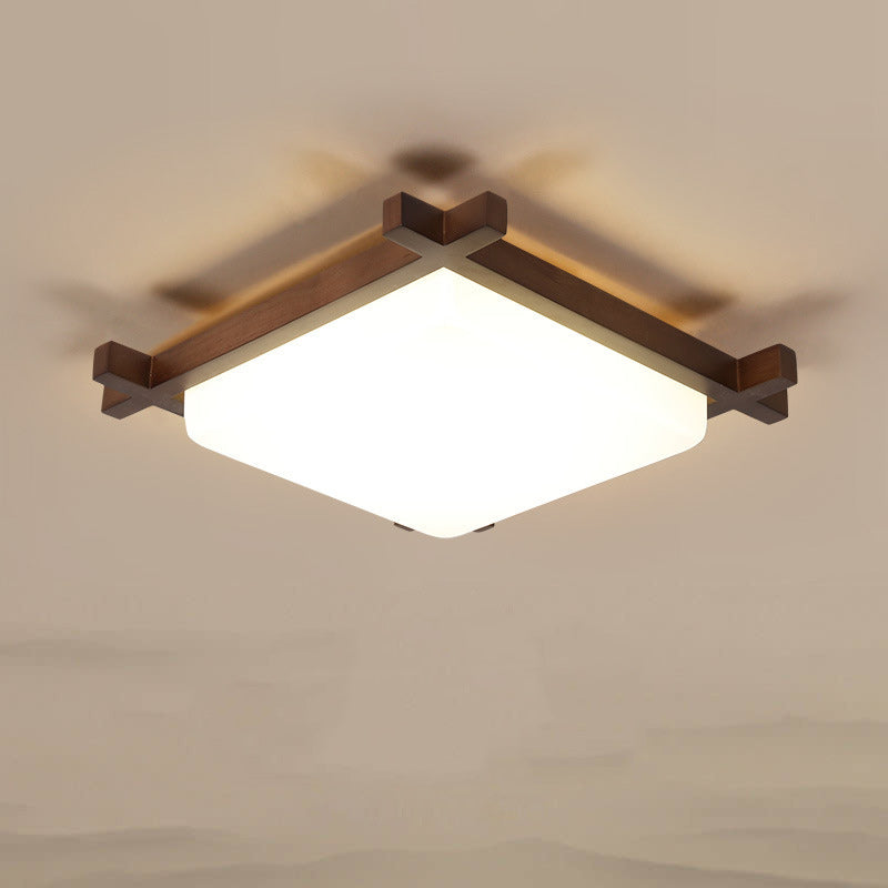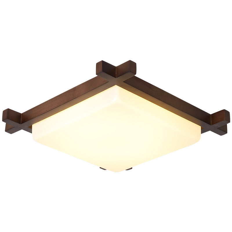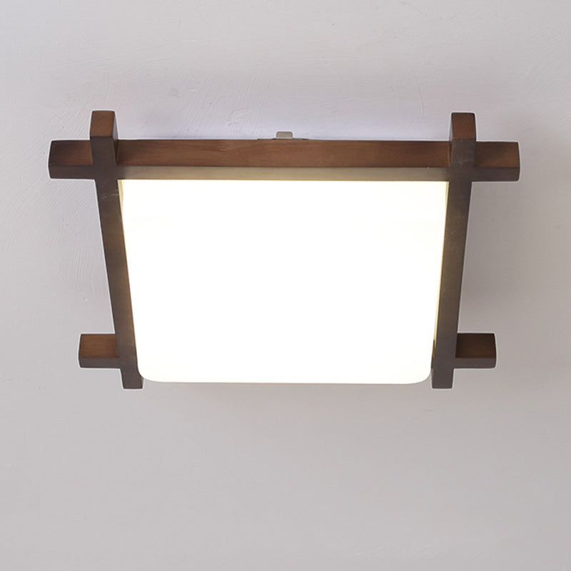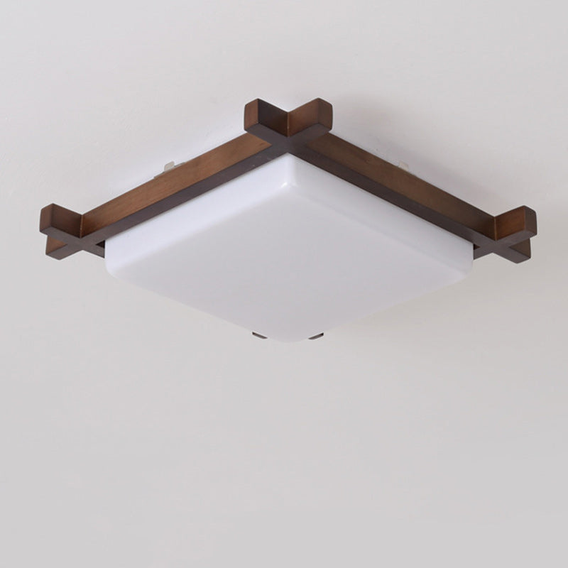 Traditional Japanese Square Rubber Wood Acrylic LED Flush Mount Ceiling Light For Bedroom