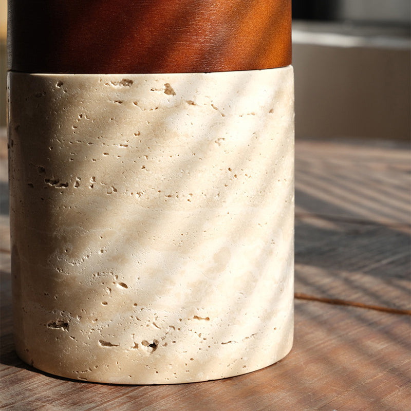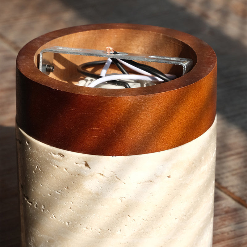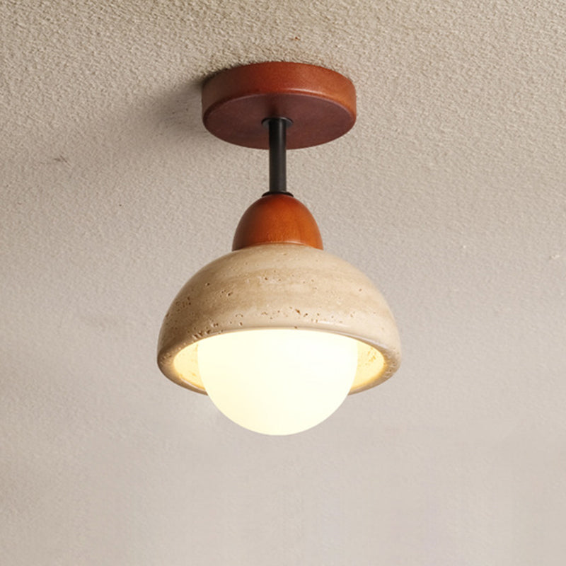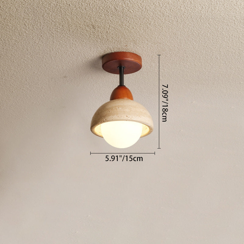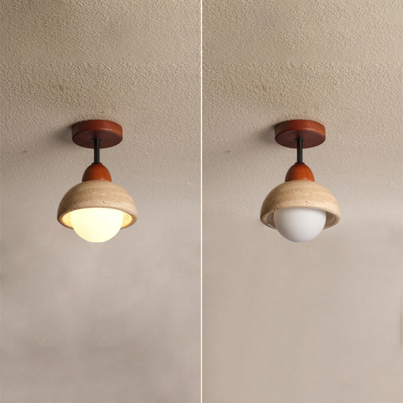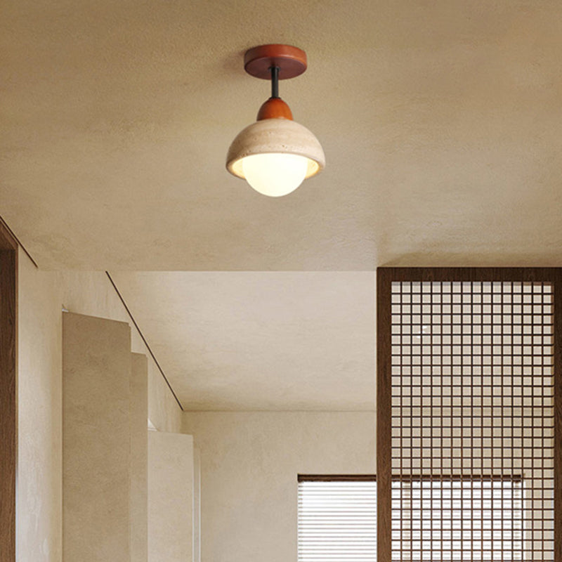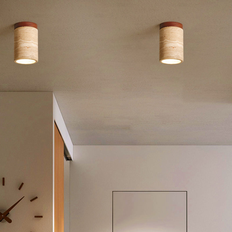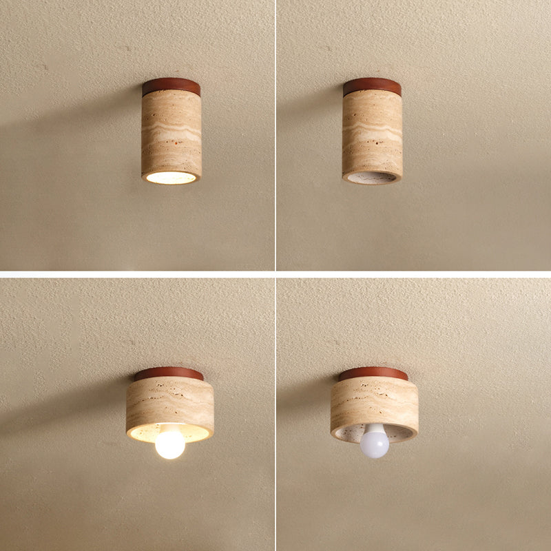 Traditional Japanese Wabi-Sabi Cylinder Yellow Travertine Solid Wood 1-Light Semi-Flush Mount Ceiling Light For Bedroom
