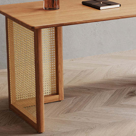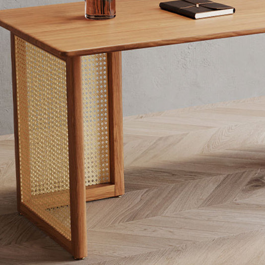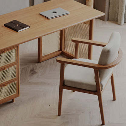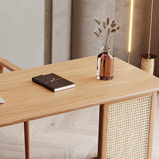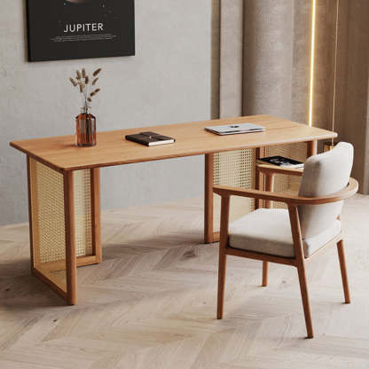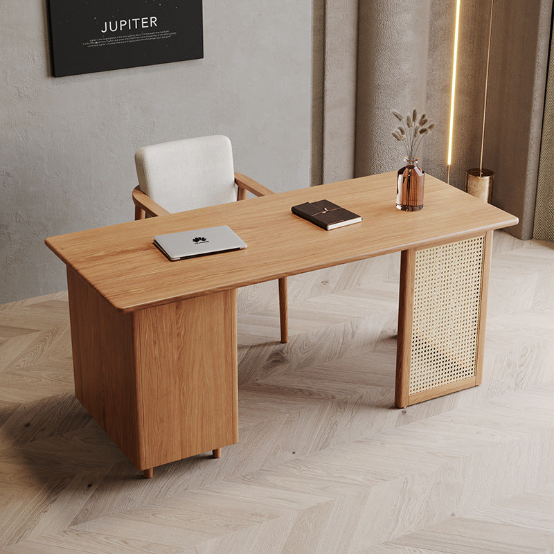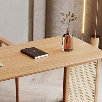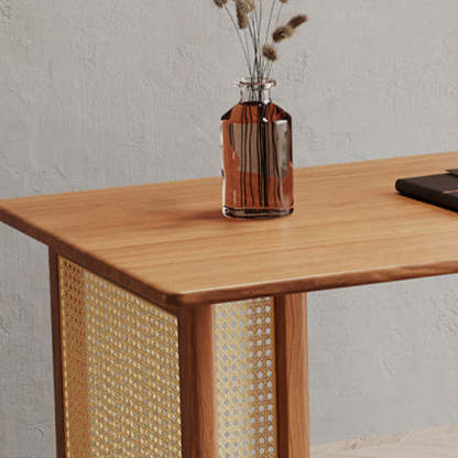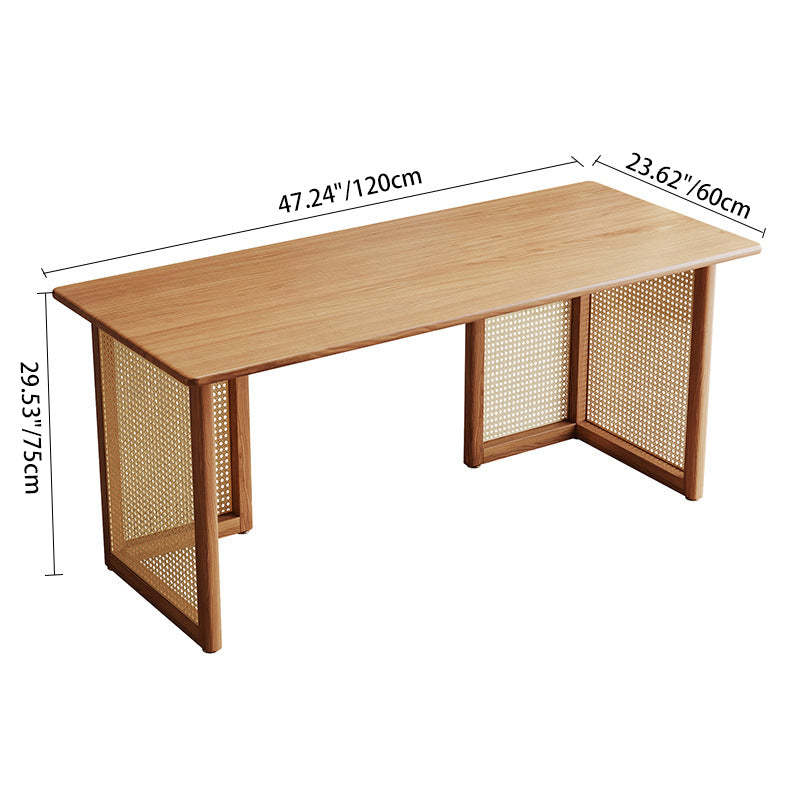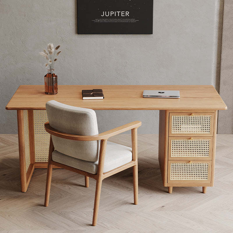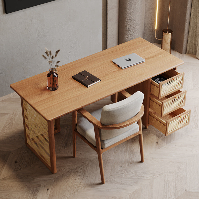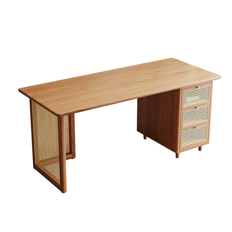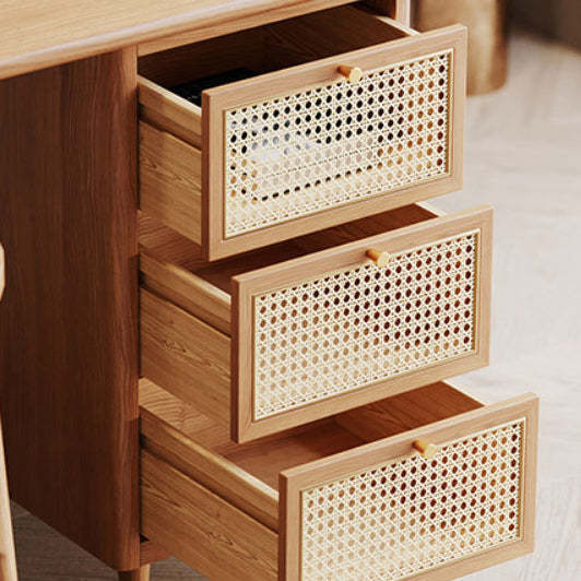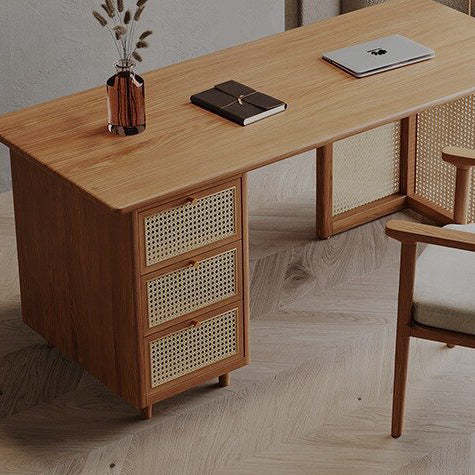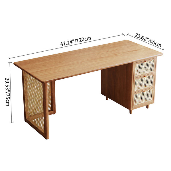 Traditional Japanese Weaving Imitation Rattan Wood Rectangular Desks 3-Drawer For Home Office