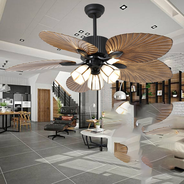 Traditional Retro Leaves Texture ABS Fan Glass Hexagonal Shade 3-Light Downrods Ceiling Fan Light For Living Room