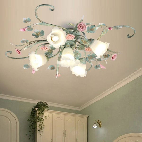 Traditional Rustic Rose Bent Leaf Branch Glass Iron Ceramic 4/5 Light Semi-Flush Mount Ceiling Light For Living Room