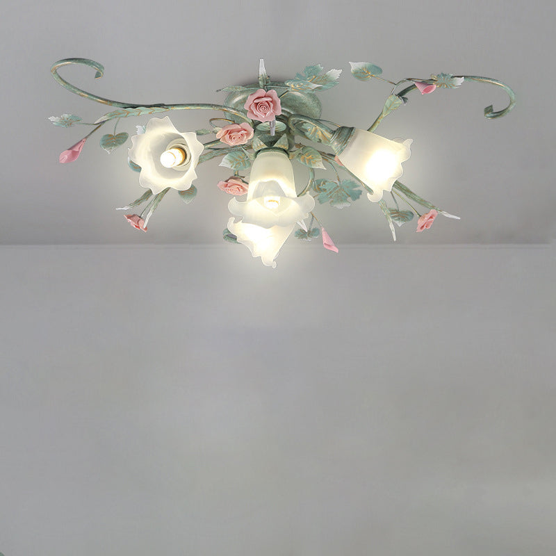 Traditional Rustic Rose Bent Leaf Branch Glass Iron Ceramic 4/5 Light Semi-Flush Mount Ceiling Light For Living Room
