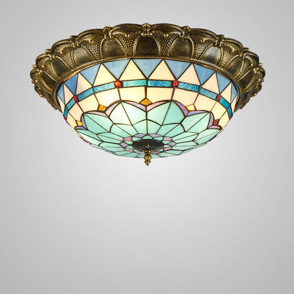 Traditional Tiffany Round Dome Iron Stained Glass LED Flush Mount Ceiling Light For Living Room