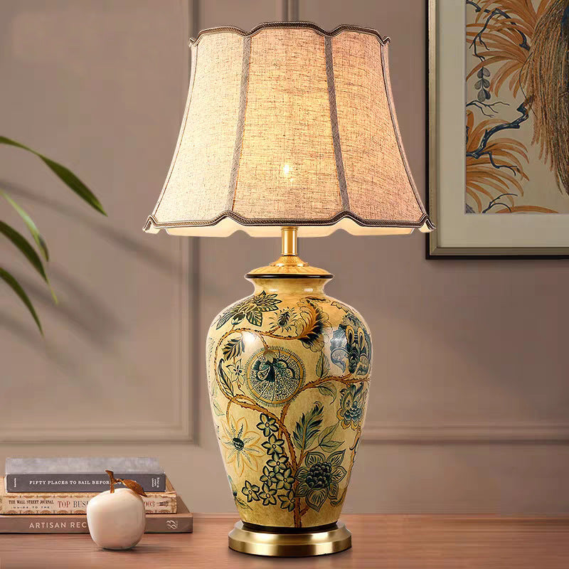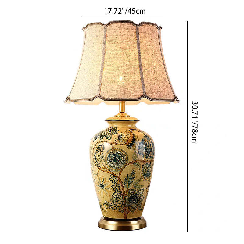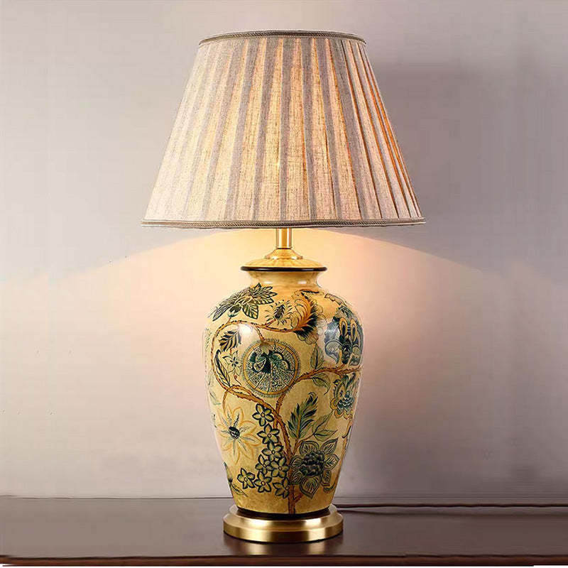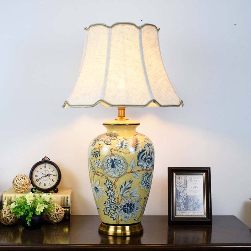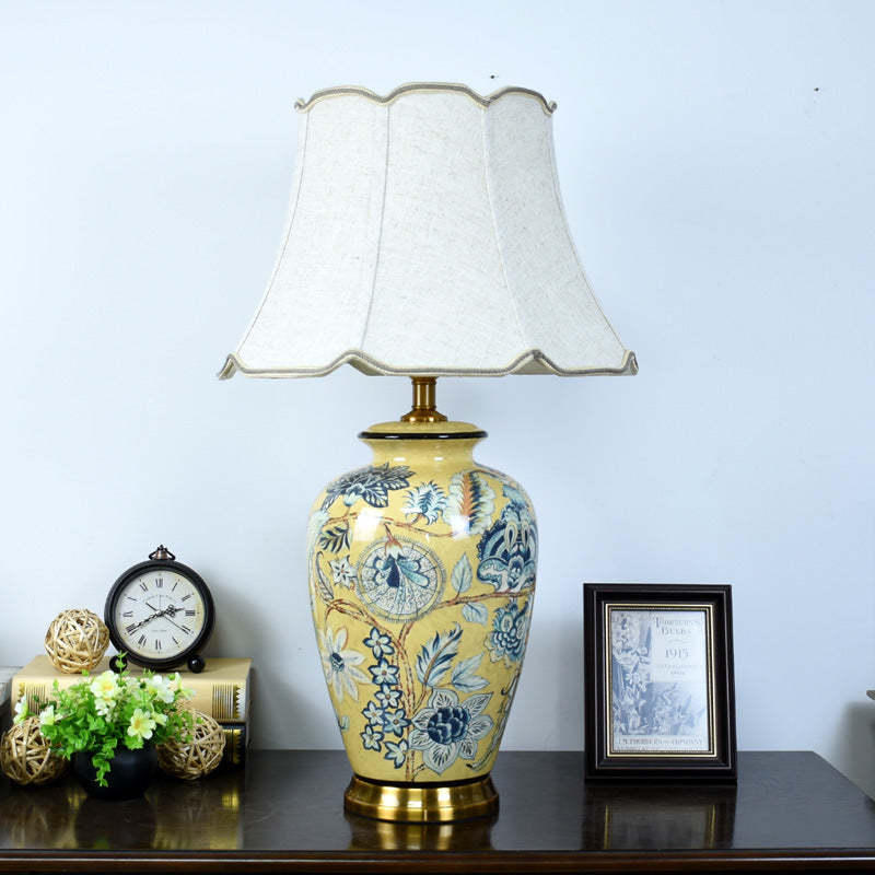 Traditional Vintage Flower Bird Round Distressed Fabric Ceramic 1-Light Table Lamp For Living Room