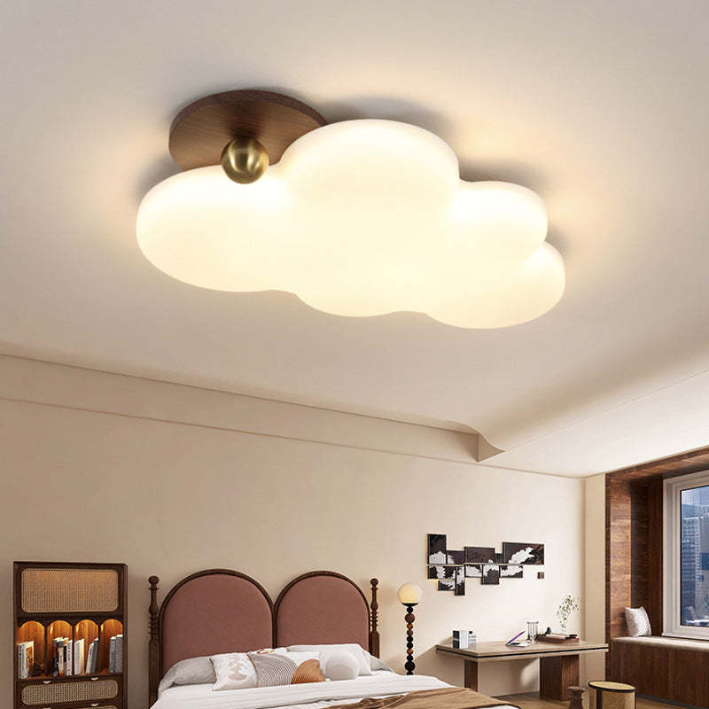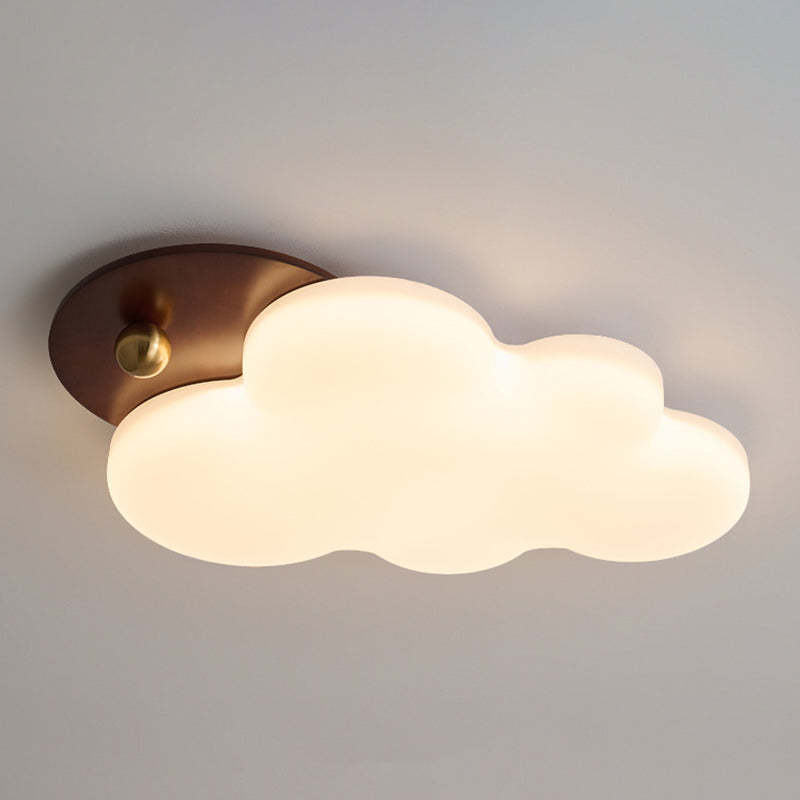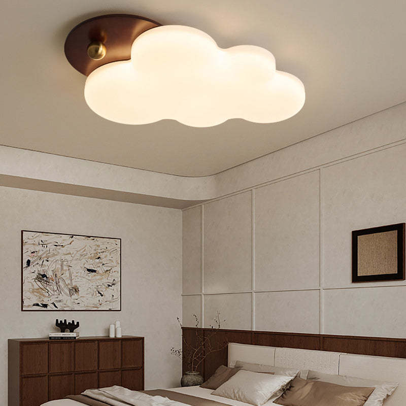 Inspired by vintage charm. this cream cloud-shaped LED ceiling light features a soft curved silhouette made from PE and natural rubber wood in walnut and white finishes. Emitting high-transparency. glare-free light. it's perfect for creating a cozy and eye-friendly atmosphere in children's rooms. bedrooms. or living spaces.
