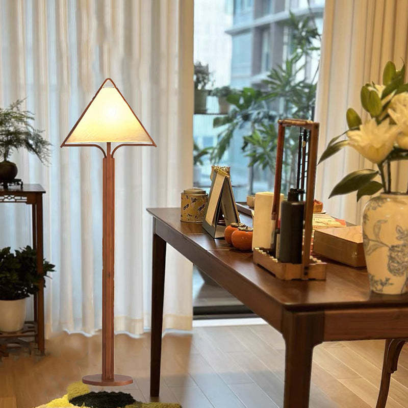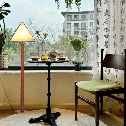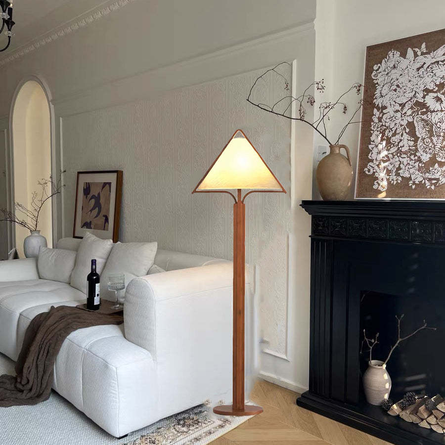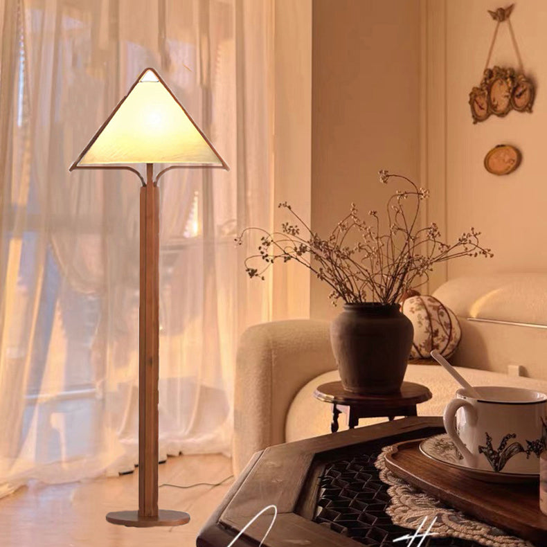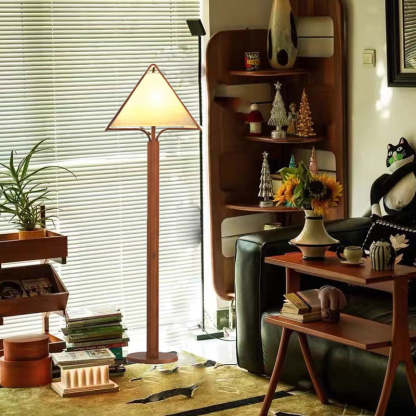 Crafted with a cherry wood finish and a conical fabric shade. this traditional vintage floor lamp brings timeless character to your living room. Its classic silhouette and warm tone make it an ideal accent for retro. mid-century. or eclectic interiors