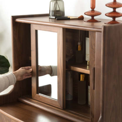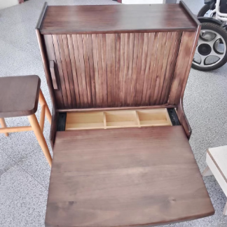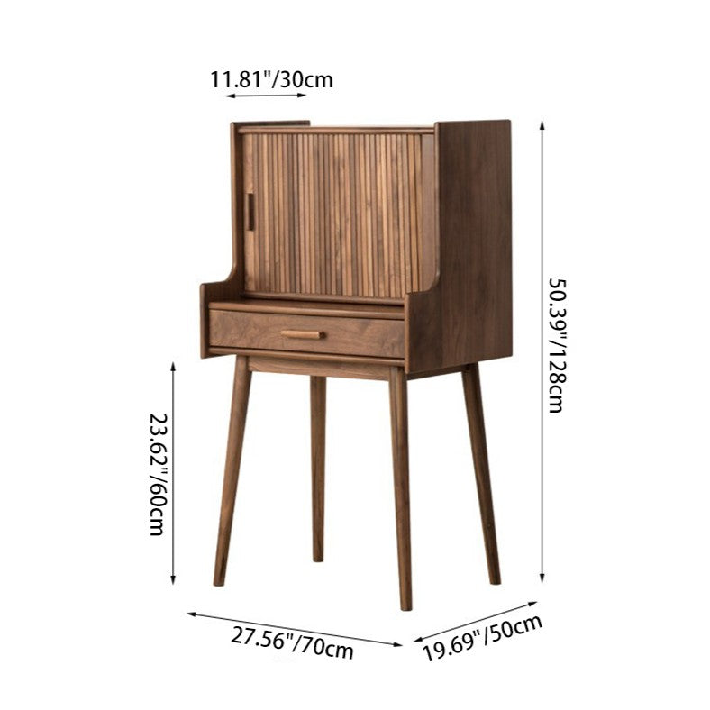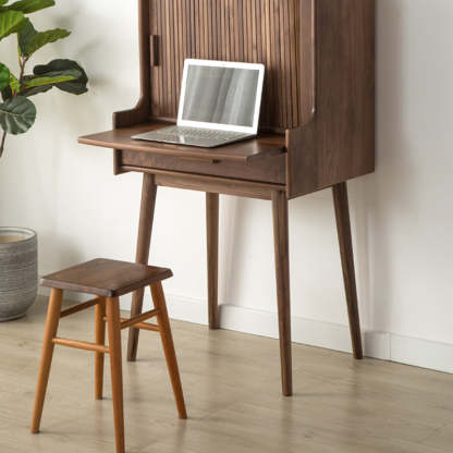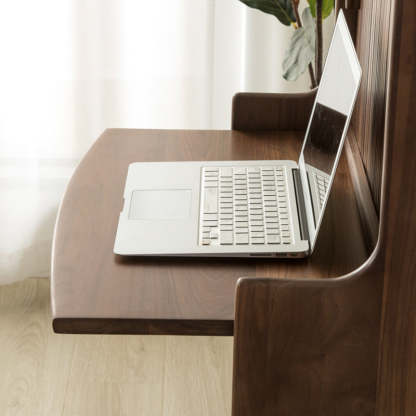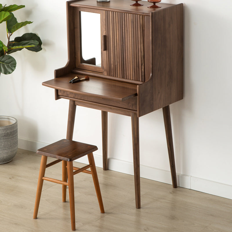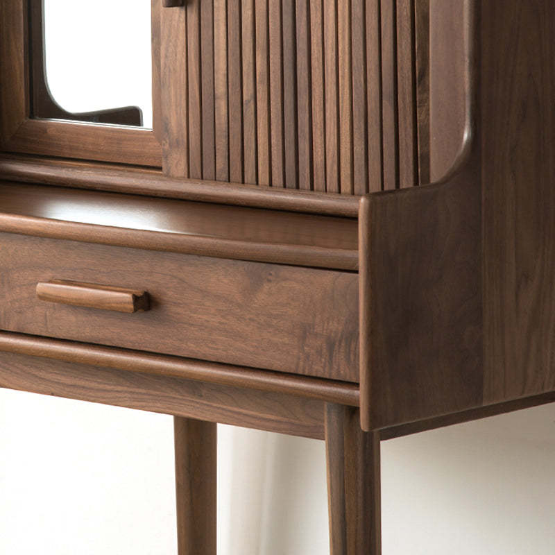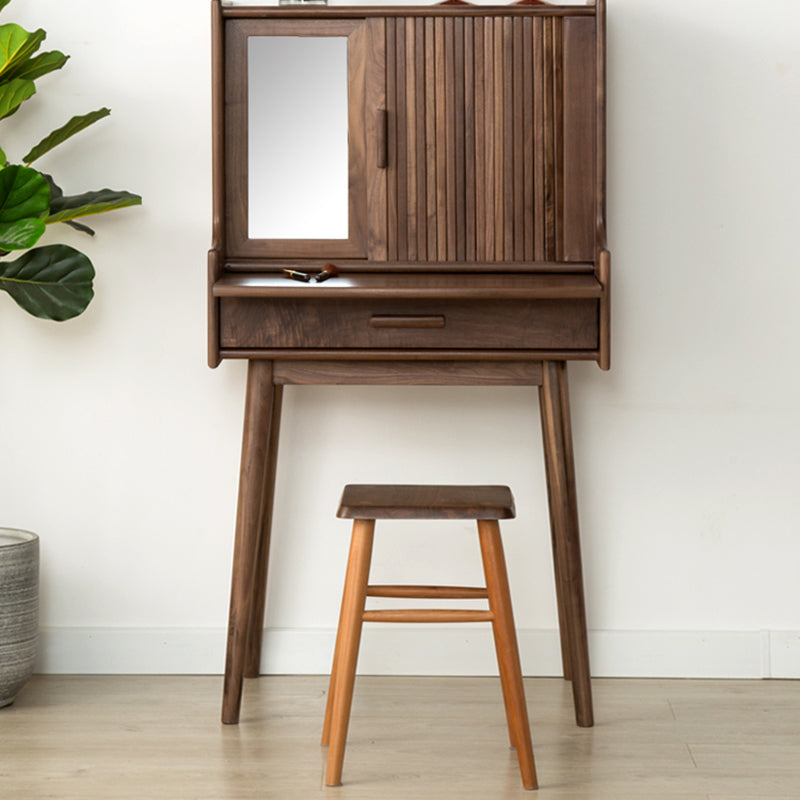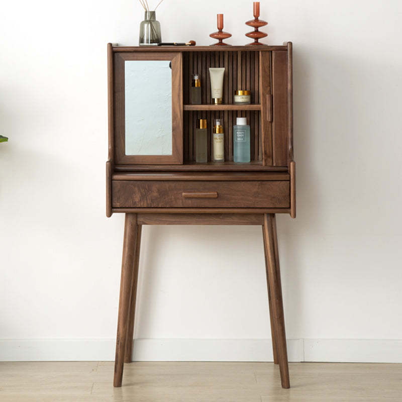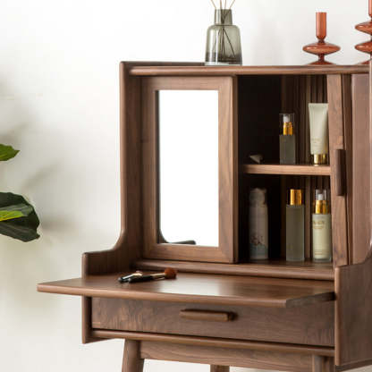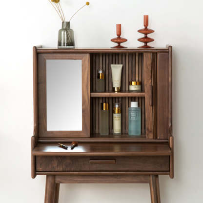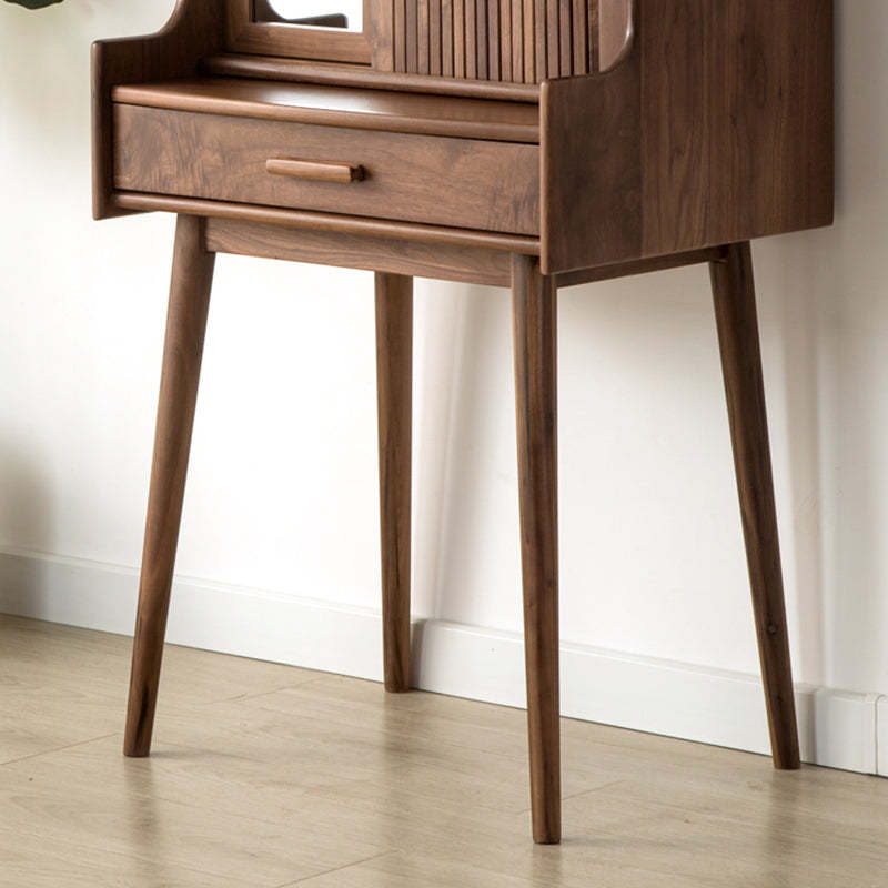 Crafted from solid wood in a rich walnut finish. this traditional vintage makeup vanity features a rectangular design with a smooth roll-top and expandable desktop. Ideal for small bedrooms or living spaces. it includes a convenient 1-drawer compartment for organized storage. Perfect blend of function and charm for classic interiors.