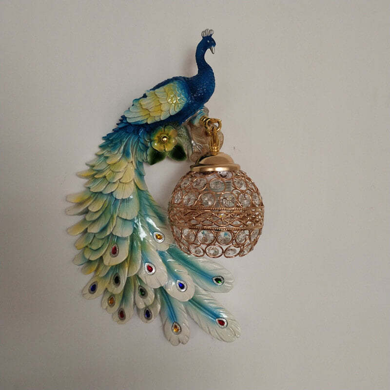Vintage Ornate Resin Long Tail Peacock Crystal Ball Shade 1-Light Wall Sconce Lamp