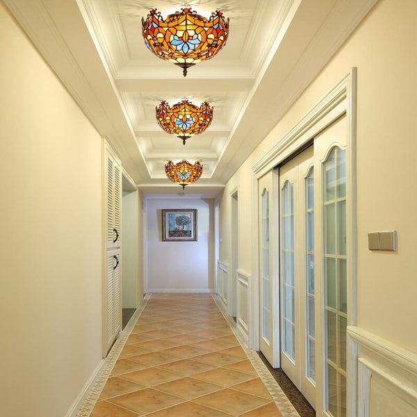 Vintage Tiffany Stained Glass Bowl Shape 2-Light Flush Mount Ceiling Light