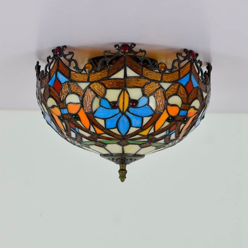 Vintage Tiffany Stained Glass Bowl Shape 2-Light Flush Mount Ceiling Light