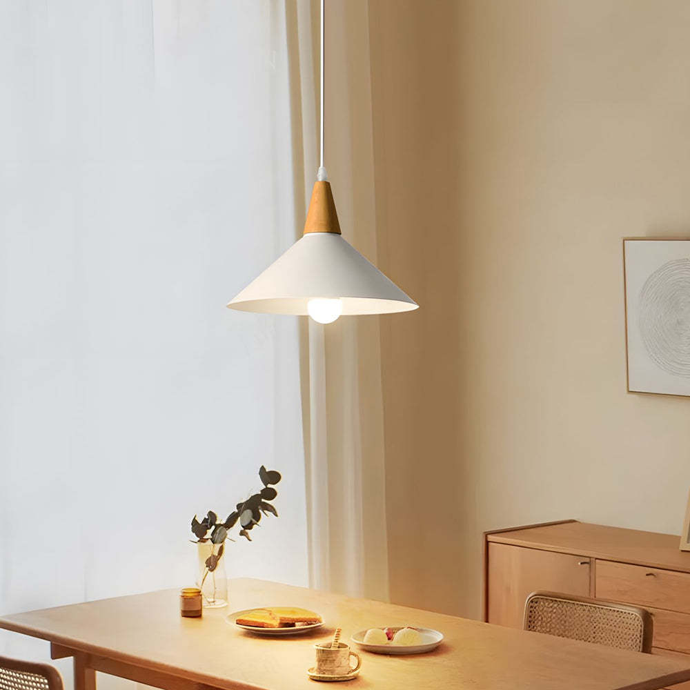 White 1-Light Nordic Metal Cone Pendant Light with Wood Top