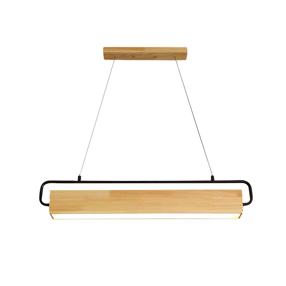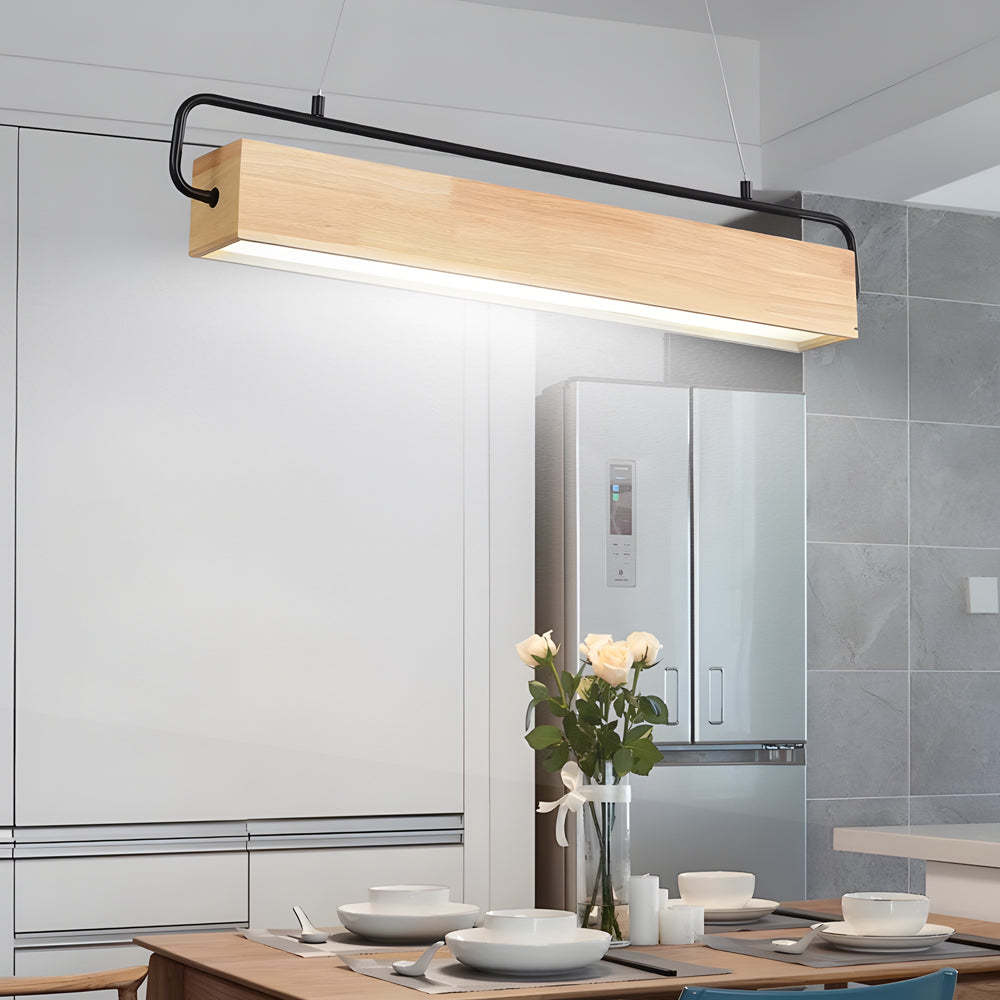 - This stylish wooden LED dining pendant light is made from natural rubber wood, and showcases a warm, inviting wood finish and a rectangular design that adds a natural touch to your indoor space. Above the wooden rectangular lamp body is a black handle that serves as a decorative piece, and is connected to the hanging wire, and can also adjust the lighting angle of this wooden pendant light.